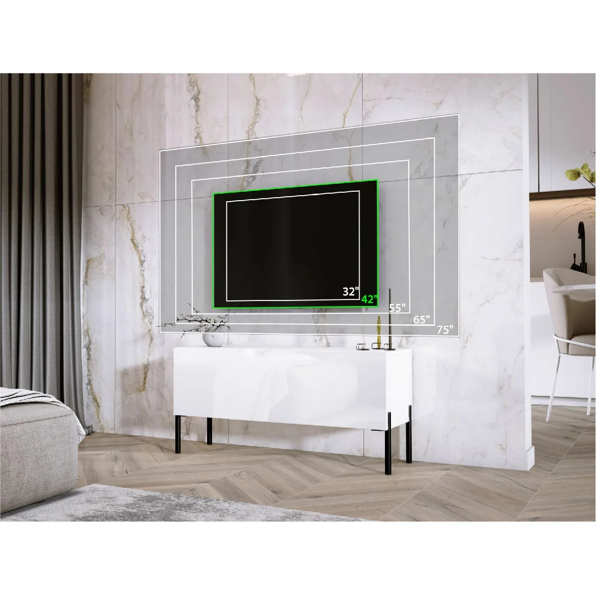 Le meuble propose un rangement principal unique et facilement accessible pour conserver box, console ou télécommandes à portée de main. La charge maximale supportée de 100 kg permet de placer un téléviseur et des équipements associés en respectant une répartition homogène. La finition blanc mat au style moderne favorise l'harmonie avec d'autres meubles du salon et limite les reflets sous l'éclairage. Sa construction en panneau de particules assure un bon compromis entre rigidité et poids pour un usage quotidien.