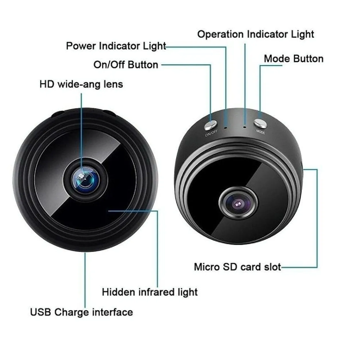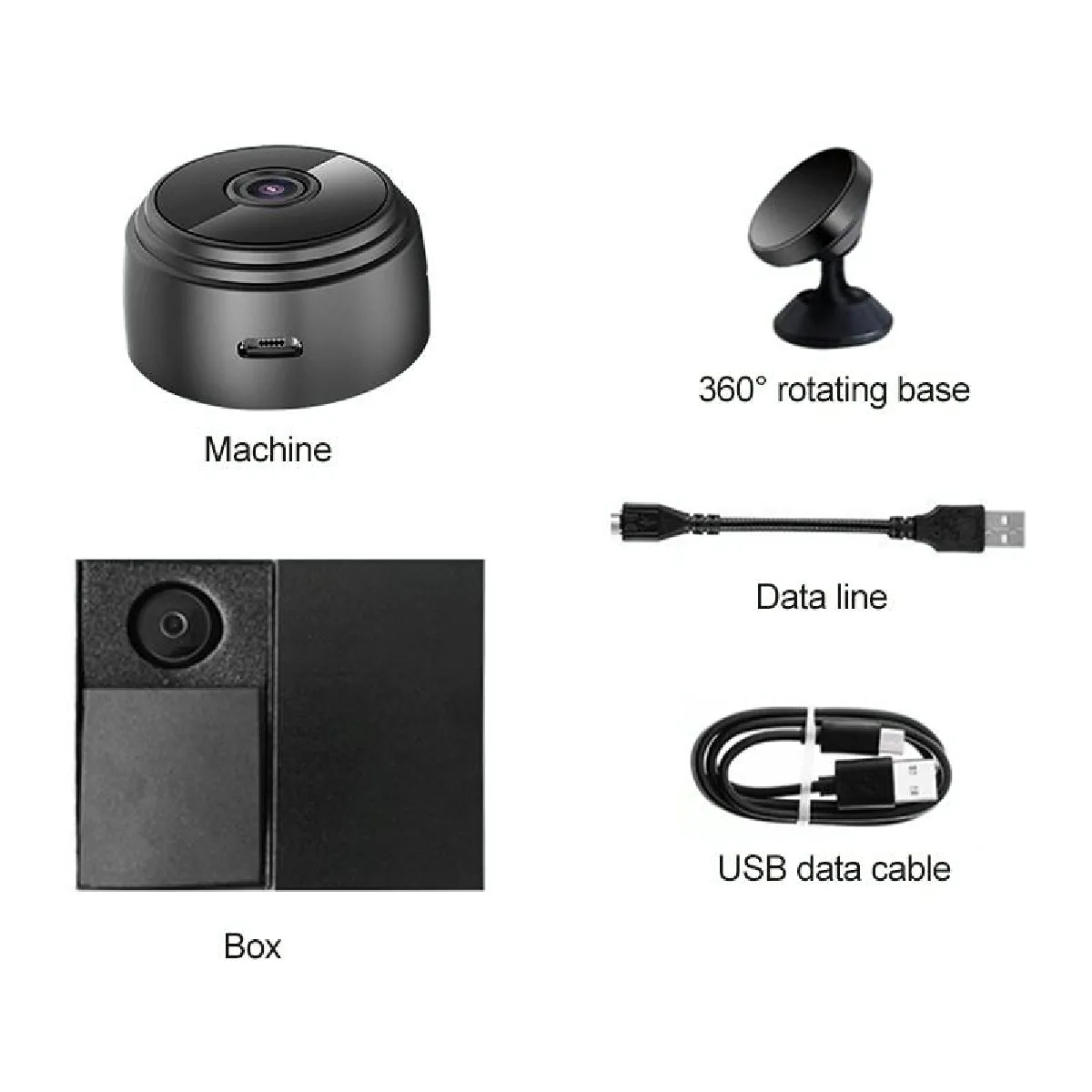 Mini camera 1080P WiFi avec vision nocturne et détection de mouvement. Capturez des images claires même dans l'obscurité grâce à ses 6 LED infrarouges. Grand angle de 150°, supporte carte TF jusqu'à 128GB. Idéale pour surveiller votre maison ou bureau discrètement.