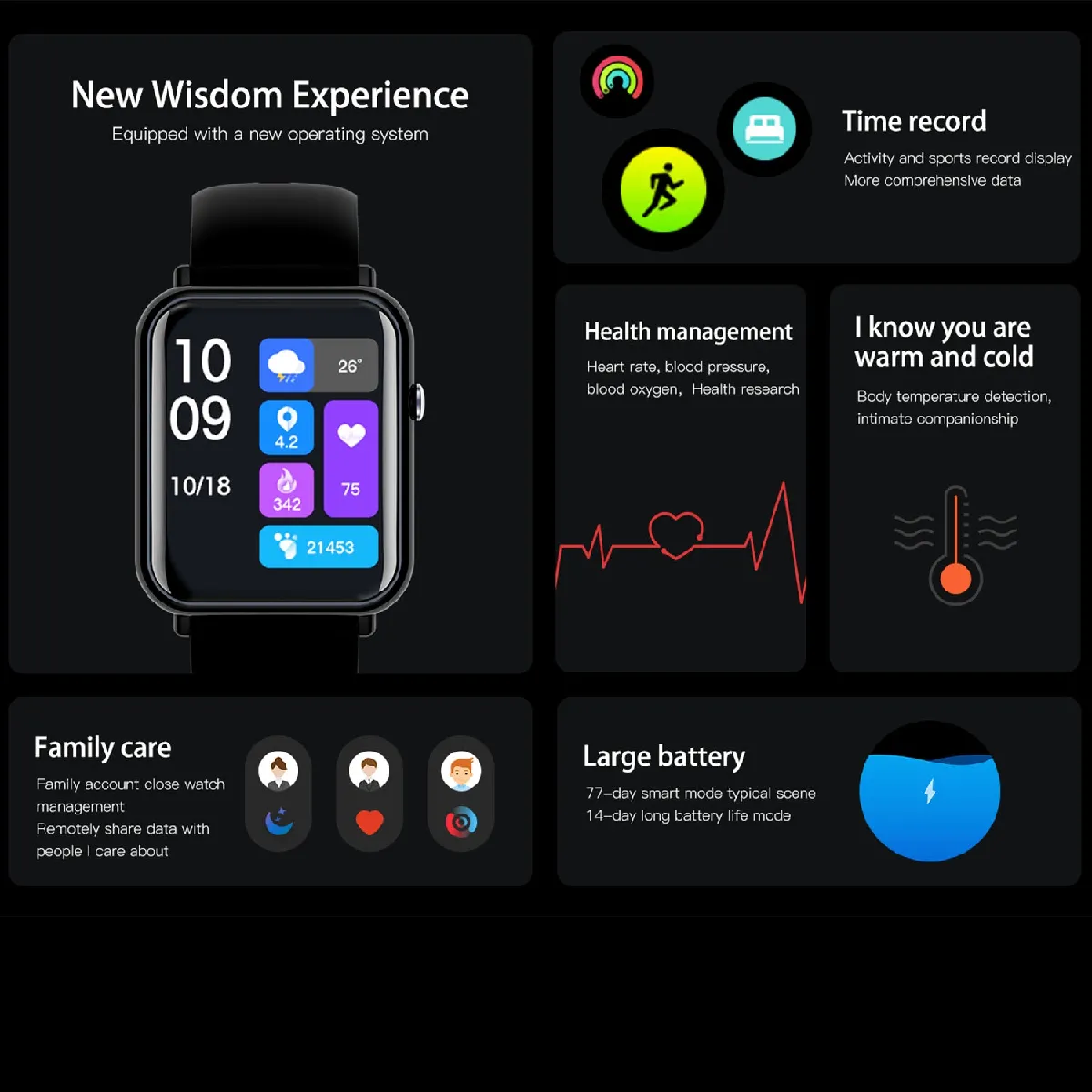 Montre connectée pas cher avec écran HD 1.69 pouces, autonomie de plus de 5 jours et mode de charge magnétique. Suivi 24h du rythme cardiaque, pression sanguine, oxygène et température corporelle. Fonctionnalités sportives avec 25 modes d'exercice, notifications en temps réel et suivi du sommeil. Étanche IP67, idéale pour un usage quotidien.