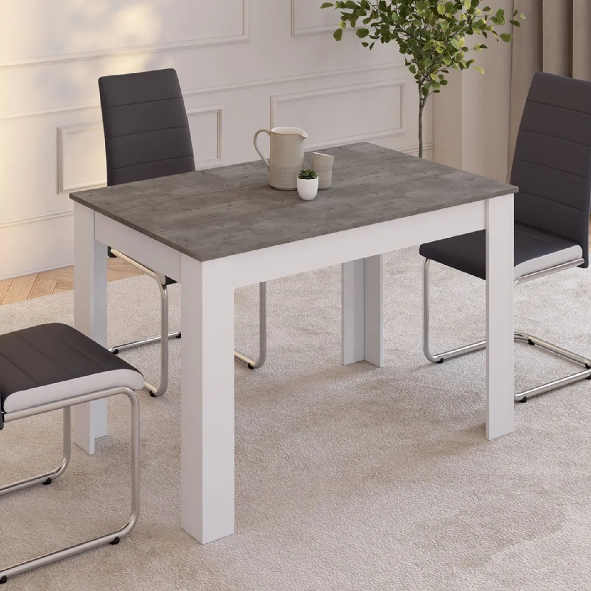 Vous cherchez une table à manger simple mais design pour vos repas du quotidien ? La table effet béton ROZY est faite pour vous !Grâce à son plateau long de 110 cm, vous profiterez de bons repas sans pour autant encombrer votre espace et accueillir confortablement jusqu'à 4 personnes !Pour créer une atmosphère chic et contemporaine, disposez autour de la table à manger nos chaises ROMANE grises.Placez la table rectangulaire dans votre cuisine ou dans votre salle à manger, dans un petit ou un grand espace. Elle trouvera sa place dans n'importe quel type d'intérieur et s'adaptera harmonieusement à votre pièce de vie ! Ses coloris sobres et originaux s'associeront parfaitement à votre mobilier et apporteront une touche de modernité !Avec sa structure en panneaux de particules de bois, cette table ultra fonctionnelle vous garantit robustesse et stabilité.Craquez pour le style contemporain et laissez vous tenter la table ROZY bicolore pour une ambiance conviviale !Dimensions de la table à manger ROZY 4 personnesDimensions globales : Longueur 110 cm x largeur 70 cm x Hauteur 72 cmEspace entre les pieds sur la longueur : 88,5 cmEspace entre les pieds sur la largeur : 48,5 cmMatériaux : Panneaux de particules de bois (PB)Capacité 4 personnesÀ monter soi-mêmeRetrouvez l'ensemble de notre collection contemporaine sur notre boutique en ligne !