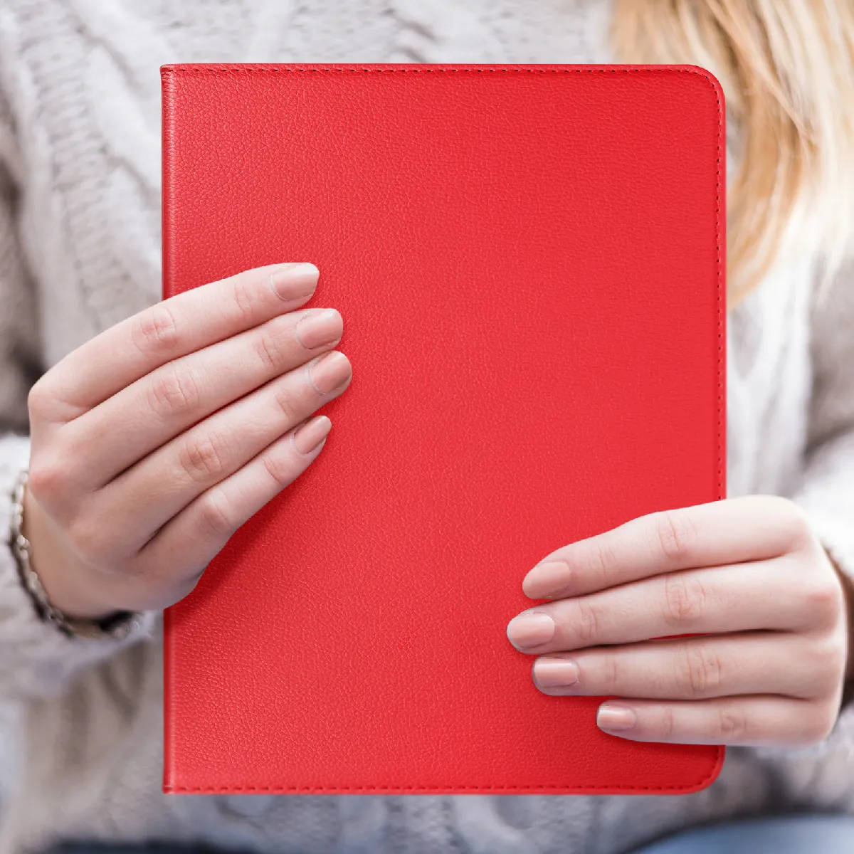 Housse clapet pour iPad Pro 13 2024. Protection intégrale avec coque rigide. Design élégant en simili cuir effet grainé. Système rotatif 360° pour une visualisation en mode portrait ou paysage. Fermeture à sangle élastique. Fonctions accessibles