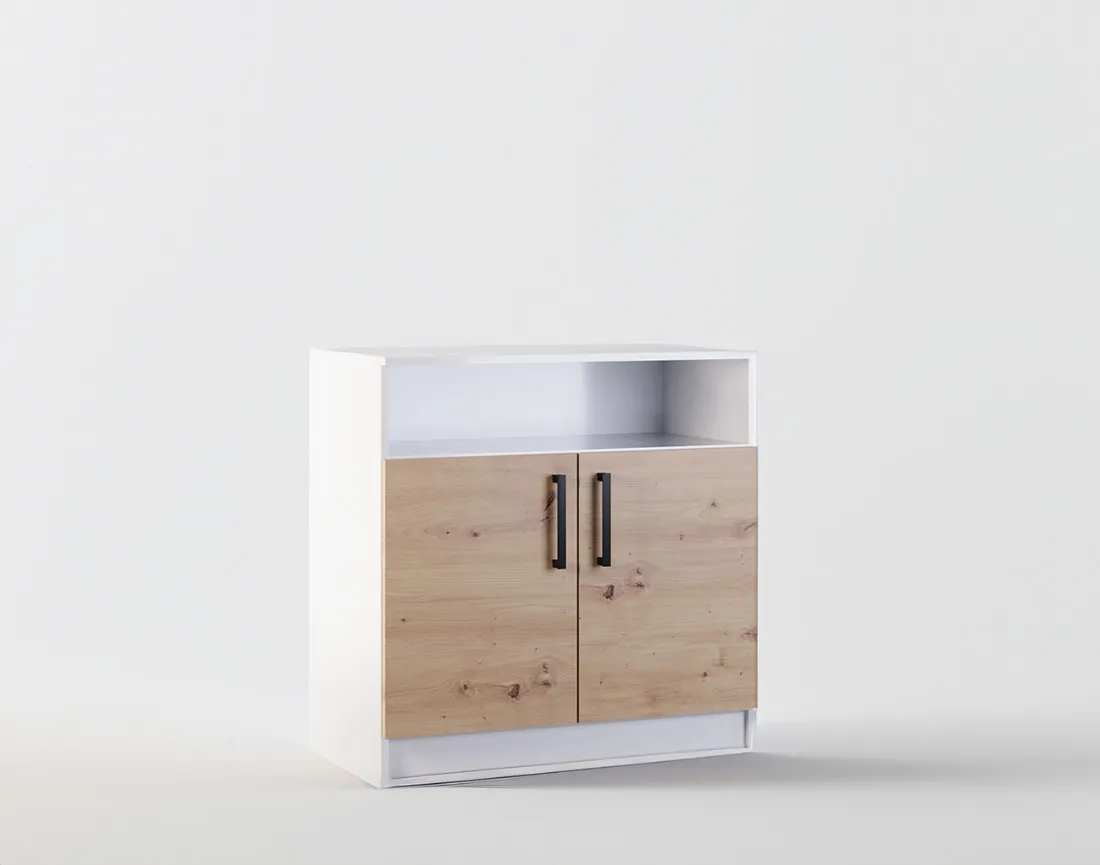 Commentaire vendeur : Caractéristiques techniques :Origine : EuropeGarantie : 2 ansCouleur : Bois / BlancType de produit : CommodeSystème d'ouverture Push : NonNombre d'étagères : 1Nombre de portes : 2Produit recyclable : TotalementMatière de la structure : Panneaux de particulesDétail des matières : Matières principales : Panneaux de particules – Pieds : Plastique – Poignées : Plastique – Epaisseur du panneau : 16 mmCharge maximum : 20Essence de bois : Panneaux de particulesFinition : SatinéePieds : PlastiqueMatière poignées : PlastiqueEpaisseur panneau : 16Poids : 27Style : ContemporainPrésentation de la marque : Découvrez Best Mobilier pour aménager vos espaces intérieurs et extérieurs. Du salon au séjour, en passant par le jardin, nos équipes vous proposent du mobilier tendance au rapport qualité prix imbattable.Collection : HAYATOPrésentation de la collection : Avec la collection Hayato, créer la chambre de vos rêves n’a jamais été aussi facile. Combinez les différents éléments de literie et de meubles pour un espace harmonieux, confortable et élégant.Montage : En quelques minutesNombre de colis : 1Dimensions du produitHauteur : 82 cmLargeur : 80 cmProfondeur : 43 cmHauteur des pieds : 0.5 cmDimensions des colisNombre de colis : 1Colis 1 : L48xP13xH85 cm (27 kg)Recommandations d’entretien :Dépoussiérez régulièrement. Nettoyer les salissures légères avec un chiffon humide et séchez directement. De manière générale ne laissez pas de liquides ...
