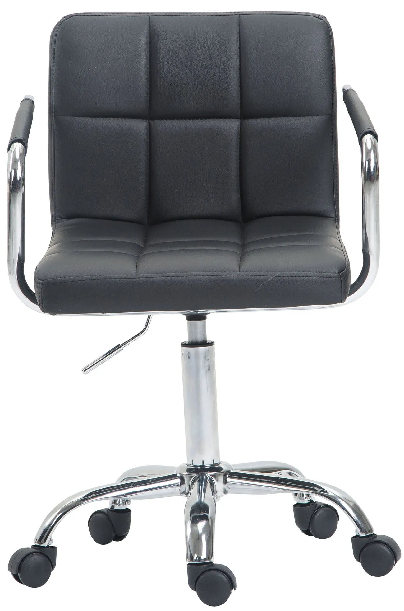 Idéal dans un espace restreint, ce fauteuil privilégie une assise confortable au quotidien grâce à un rembourrage de 6 cm et un revêtement en similicuir. La hauteur réglable de 45 à 56 cm aide à maintenir une posture adaptée selon la hauteur du bureau. Son dossier peu haut facilite l'intégration dans un bureau moins spacieux tout en apportant le soutien nécessaire pour des sessions de travail courtes à modérées. Le piètement en métal chromé, associé à des accoudoirs partiellement revêtus, offre une signature visuelle moderne et soignée qui s'accorde à de nombreux environnements professionnels ou domestiques.