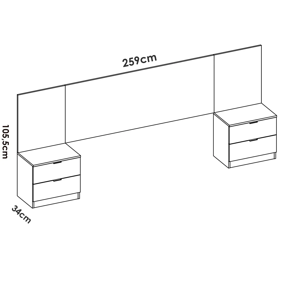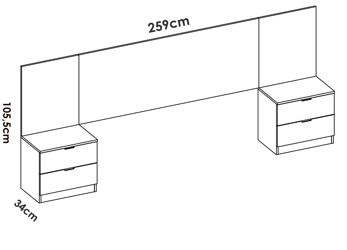 Les deux chevets latéraux proposent chacun 2 tiroirs, offrant une organisation simple pour les objets du soir et les accessoires. Les façades en blanc imitation lamelles assurent une finition homogène qui adoucit visuellement le volume total. Avec une profondeur de 34 cm, l'ensemble optimise le passage autour du lit et limite la saillie. La structure en bois mélaminé contribue à une surface résistante aux usages courants de la chambre, tout en se nettoyant rapidement. Le format de 96 cm de haut crée un appui confortable pour les oreillers et met en valeur le mur support.