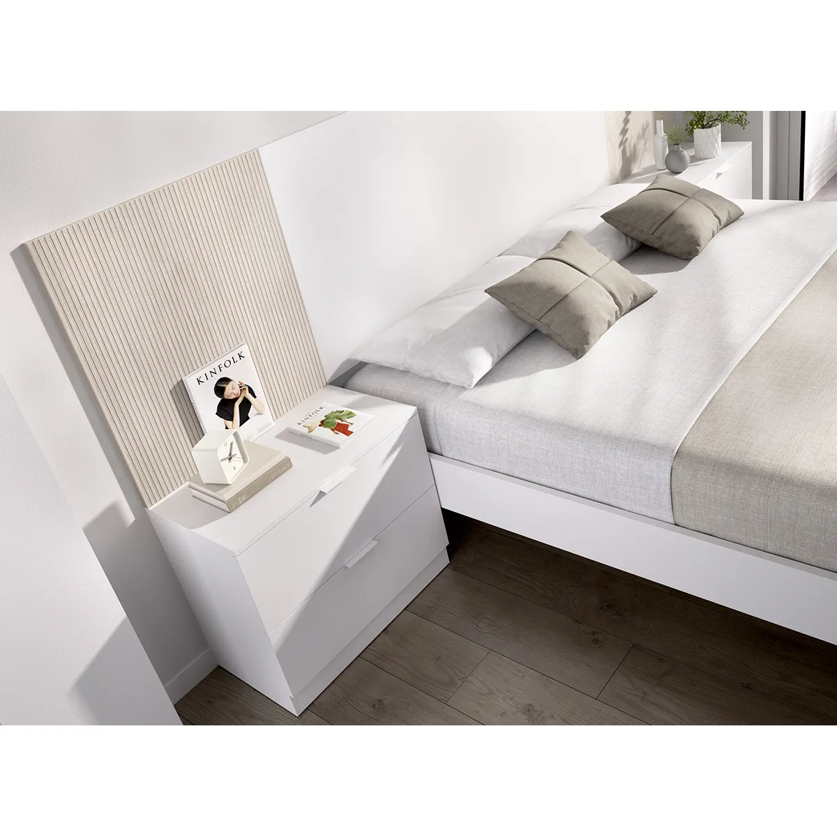 Tête de lit scandinave avec chevets intégrés, finition blanc imitation lamelles