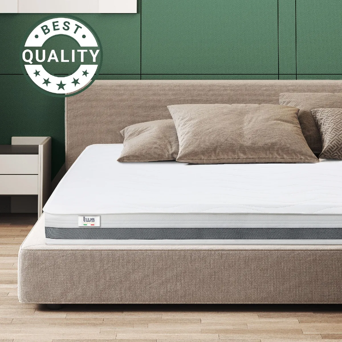 MATELAS THERMOSENSIBLE. Fabriqué avec un matériau thermosensible spécial expansé à l'eau, le matelas s'adapte parfaitement à la forme du corps et accompagne chaque mouvement, garantissant un repos continu et sans interruption. Les matériaux sont certifiés et exempts de substances nocives telles que le formaldéhyde, le mercure ou d'autres métaux lourds.