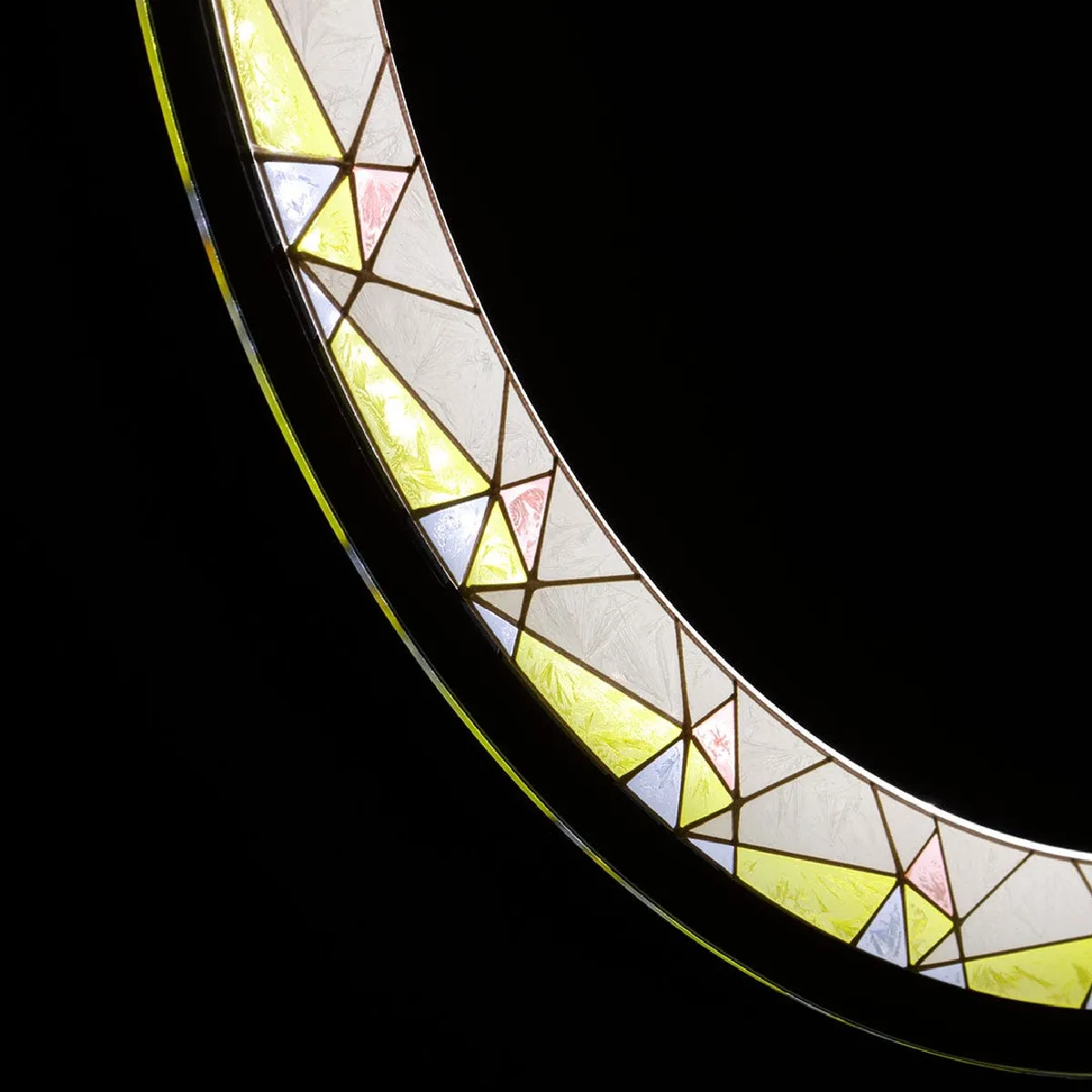 Le contour décoratif est composé de multiples triangles colorés rétroéclairés par une bande LED, offrant une lumière diffuse agréable pour les soins quotidiens. Le miroir affiche un diamètre de 60 cm, une profondeur réduite de 2 cm et une orientation verticale, pratiques pour optimiser la place audessus d'un meuble vasque. La teinte grise du cadre en métal se marie aisément avec des ambiances modernes et des surfaces texturées.
