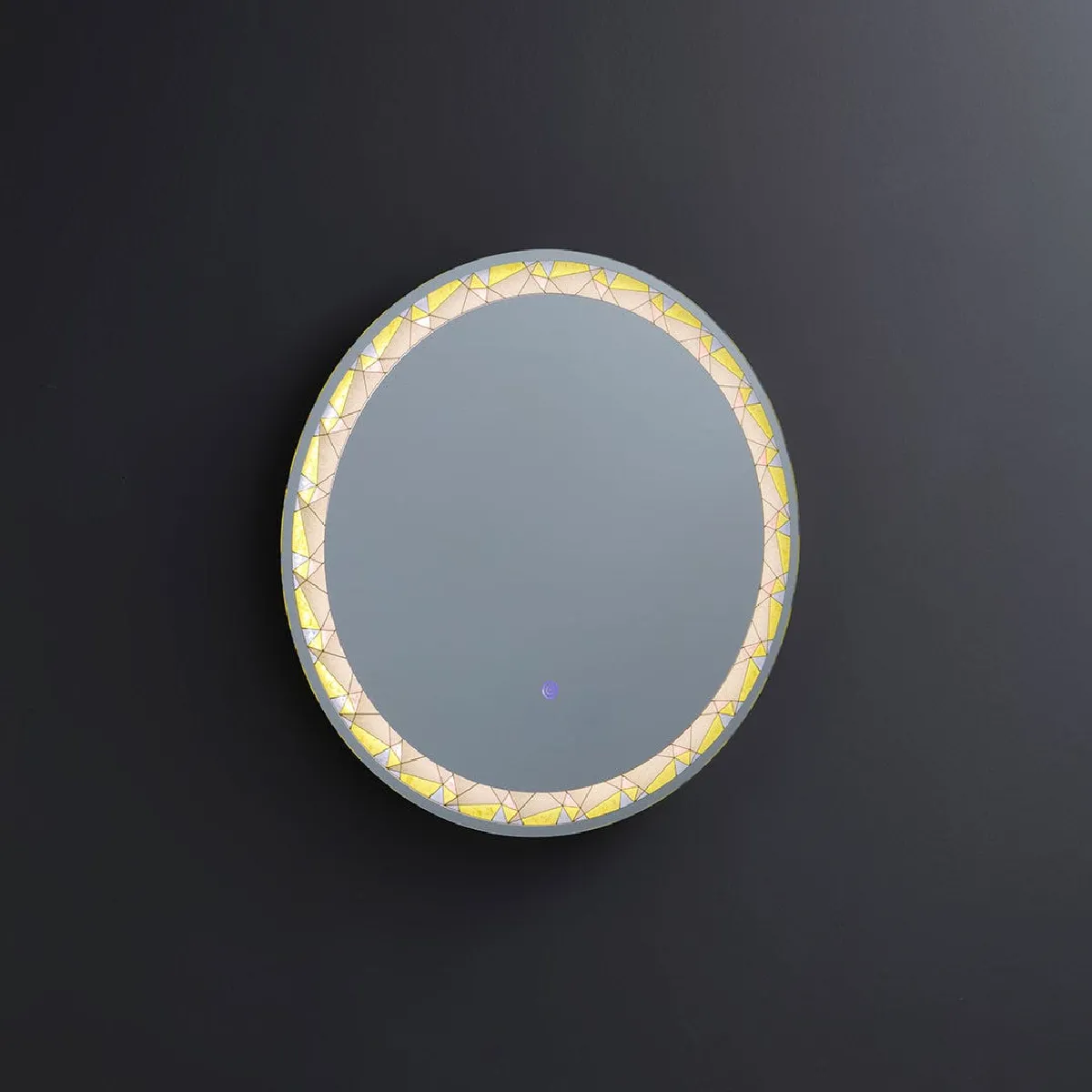 La forme ronde de 60 cm adoucit les lignes de la pièce et facilite l'alignement aucentre du plan de toilette. L'éclairage périphérique met en avant la décoration colorée tout autour du miroir, utile pour créer un point focal sans multiplier les accessoires. La conception lumineuse favorise un repère visuel net pour le rasage ou le maquillage, tandis que la faible épaisseur de 2 cm simplifie la pose murale et préserve la profondeur disponible.