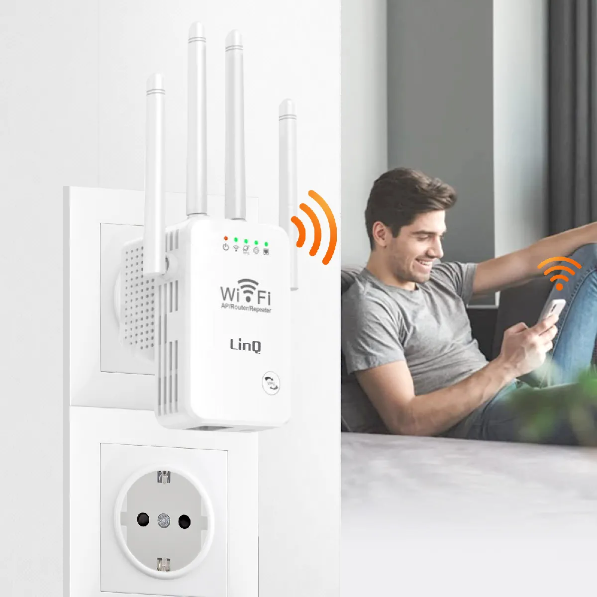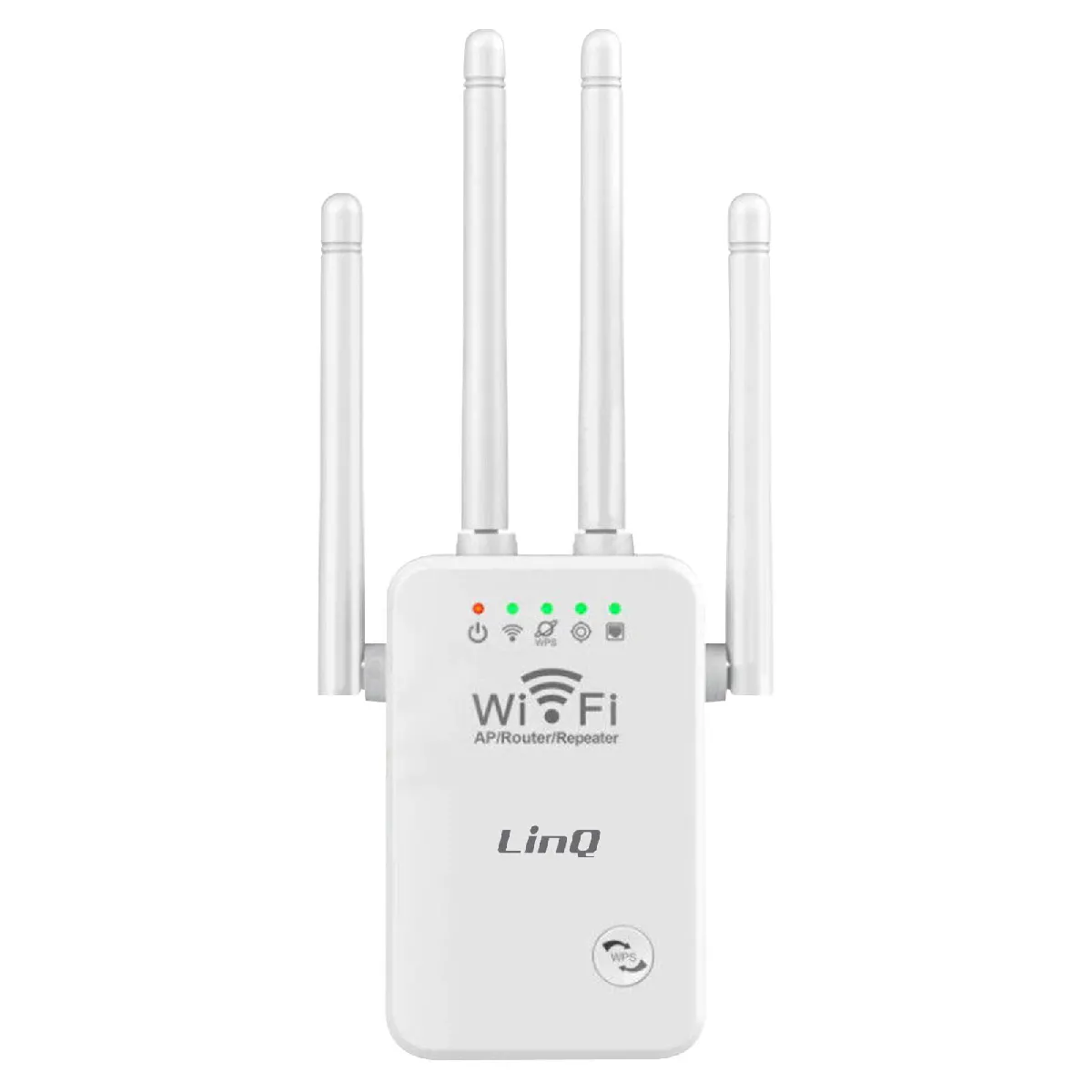 Répéteur Wifi sans-fil LinQ WLAN 500. Grande portée. Haute transmission jusqu'à 300 Mbps. 4 antennes réglables pour un meilleur réseau. Se branche sur une prise murale. Indicateur LED de signal. Compatible avec les routeurs Wi-Fi 802.11b/g/n.