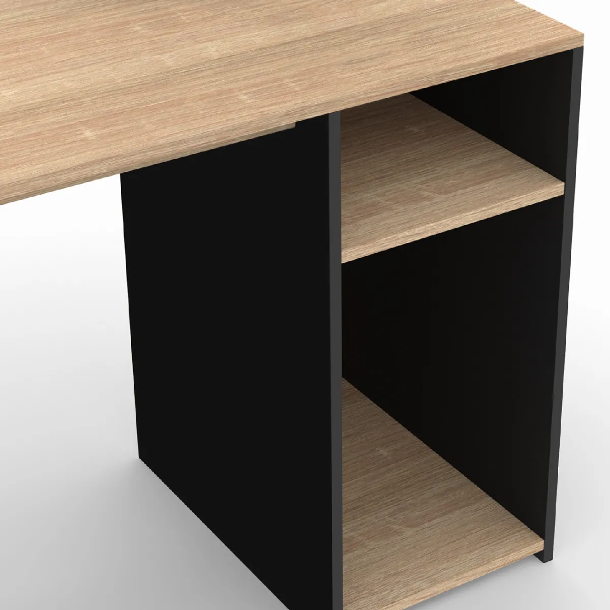 Le bureau avec étagères de rangement DAN bois façon hêtre et noir apportera une touche autant contemporaine que moderne et s'intégrera parfaitement à tout type d'intérieur.Grâce à son grand plateau de 100 cm, vous pourrez installer à la fois votre poste d'ordinateur, vos accessoires de bureau, tout en disposant d'assez d'espace pour travailler. Pratiques et fonctionnels, les espaces de rangement ouverts ont été spécialement conçus pour vous permettre de ranger vos livres, classeurs, boites de rangement ou pour disposer vos objets de décoration. Les différentes étagères du bureau DAN vous donnent la possibilité d'organiser plus aisément votre espace de travail et d'avoir tous vos documents et livres bien rangés et à portée de main en laissant le plateau du bureau libre et dégagé.Il ne vous reste plus qu'à aménager les étagères et le plateau de votre bureau avec de petits accessoires, des objets de décoration ou de petites plantes vertes pour le personnaliser à votre goût, et bien travailler en toute sérénité !Stable et robuste grâce à sa structure en particules de bois, organisez-vous un coin bureau en toute sécurité. Découvrez dès maintenant les finitions particulièrement soignées du bureau avec étagères de rangement DAN à petit prix.Dimensions du bureau bibliothèque DAN bois façon hêtre et noir Dimensions globales du bureau : Longueur 100 cm x largeur 50 cm x Hauteur 143 cmHauteur du bureau : 143 cm Hauteur plateau : 73 cm Dimensions étagères du bas : L. 30 x l. 50 x H. 50 cm + L. 30 x l. 50 x H. 16,5 cmDimensions de la petite étagère sur le plateau : L. 30 x l. 15 x H. 22 cm Dimensions de la longue étagère du haut : L. 96,5 x l. 15 x H. 22 cmMatériaux : Particules de bois (PB)Coloris : Bois façon hêtre et noir Ce bureau DAN existe en blanc et façon hêtre.Retrouvez tous nos modèles de bureaux sur notre boutique en ligne. l