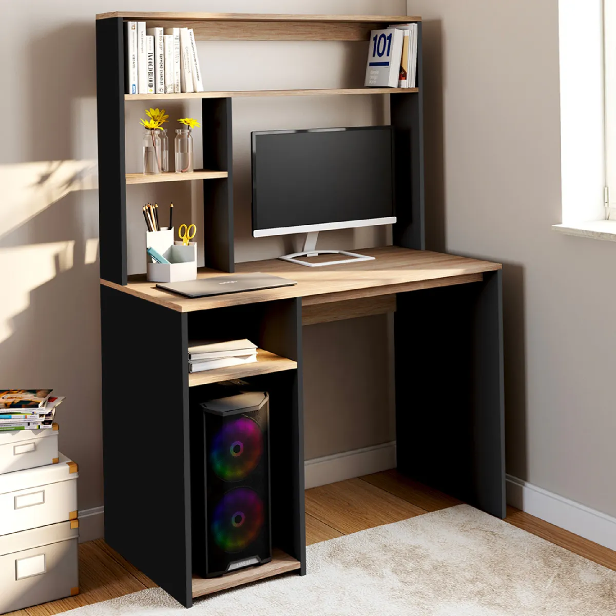 Bureau avec étagères - Grand plateau 100 cm - Rangement optimisé - Particules de bois