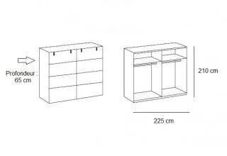 L'armoire de 225 x 210 x 65 cm dispose de 2 portes coulissantes, dont une avec miroir, pour un accès fluide et un gain de place. L'intérieur intègre 2 étagères et 2 tringles, offrant un rangement structuré pour vêtements et accessoires. Les deux chevets à 2 tiroirs, dotés de poignées finition noire, complètent l'ensemble avec des rangements de proximité pratiques. L'entretien se limite à un chiffon humide puis sec, ce qui assure des surfaces résistantes et faciles à vivre au quotidien.