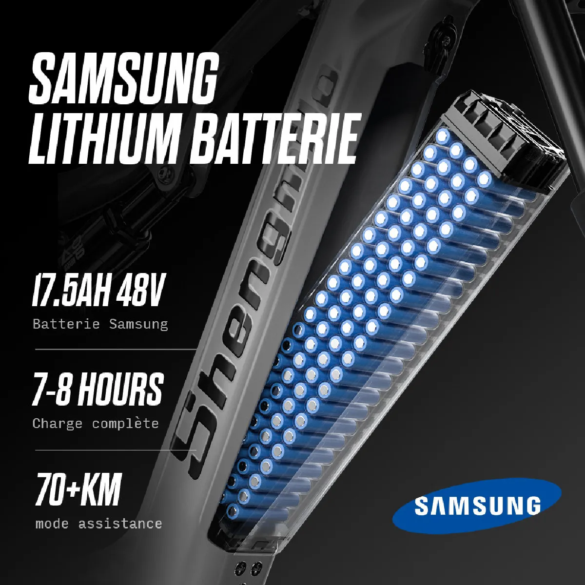 Equipé d'une batterie SAMSUNG 48V 17,5Ah , l'autonomie de croisière purement électrique est de 40 à 50 kilomètres .