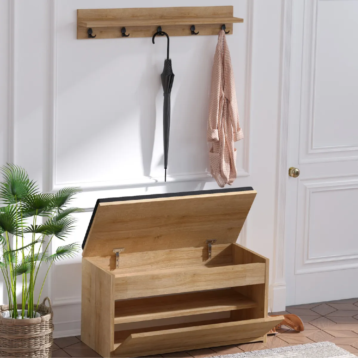 Meuble d'entrée avec porte-manteau mural et coffre de rangement