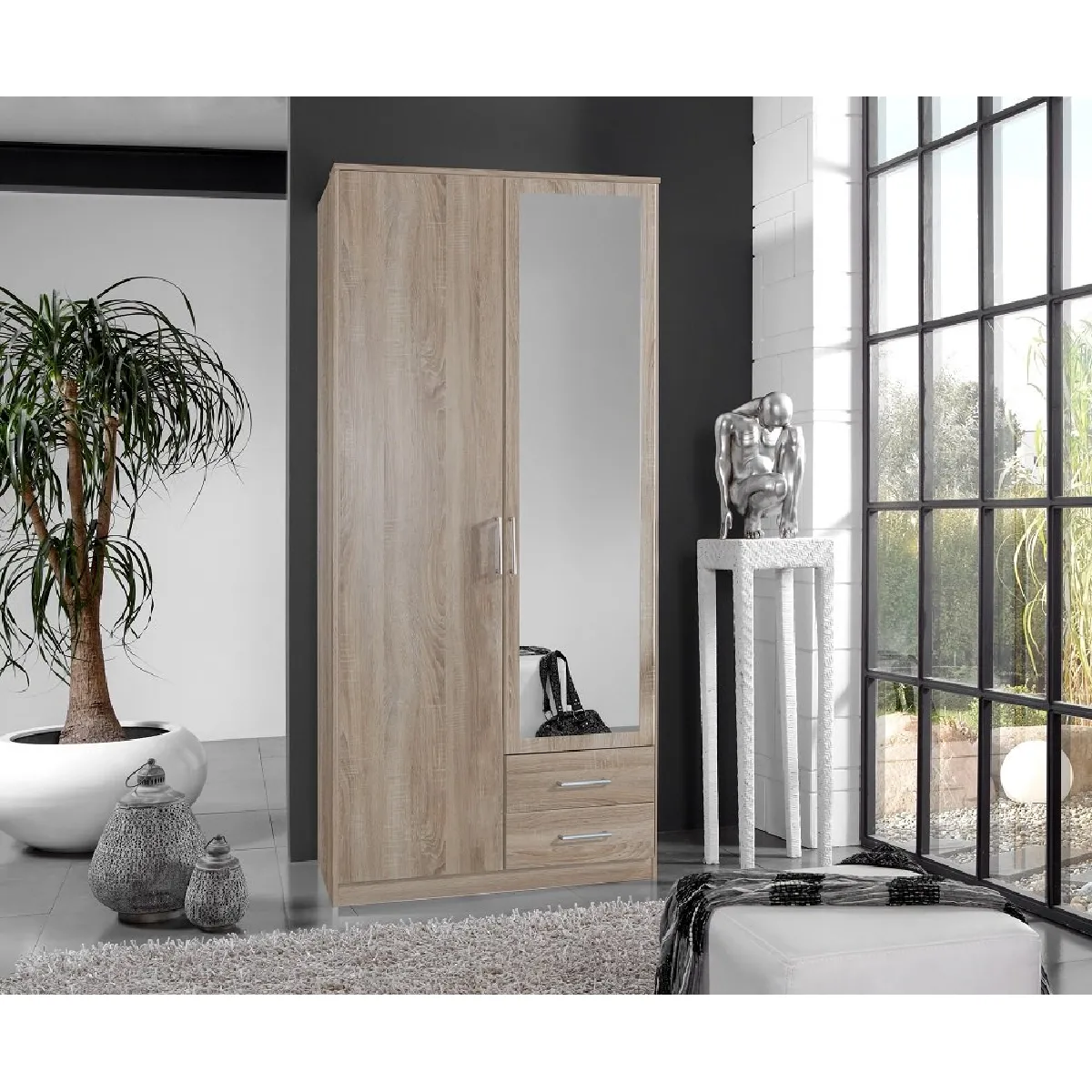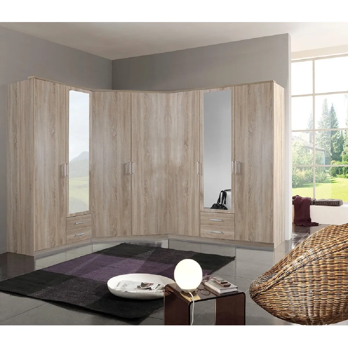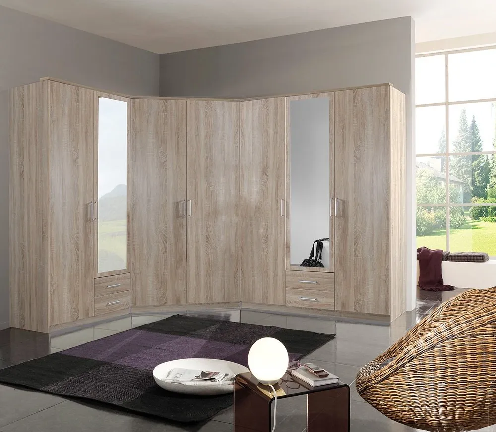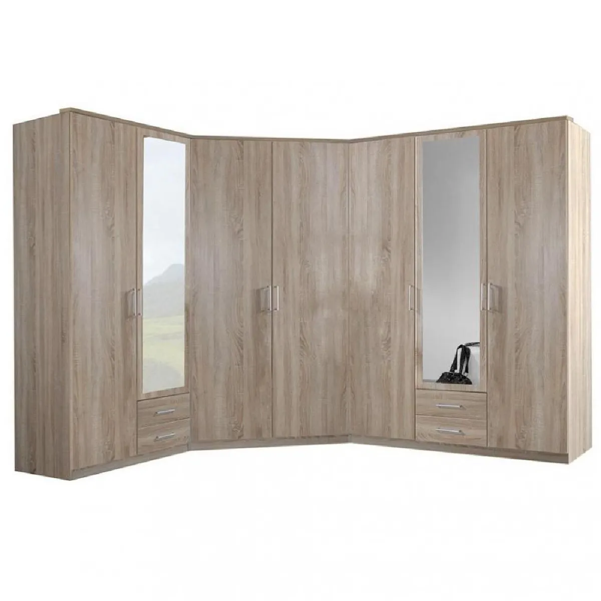 - Composition : 2 armoires + 1 armoire d'angle, 7 portes dont 2 avec miroir, 4 tiroirs