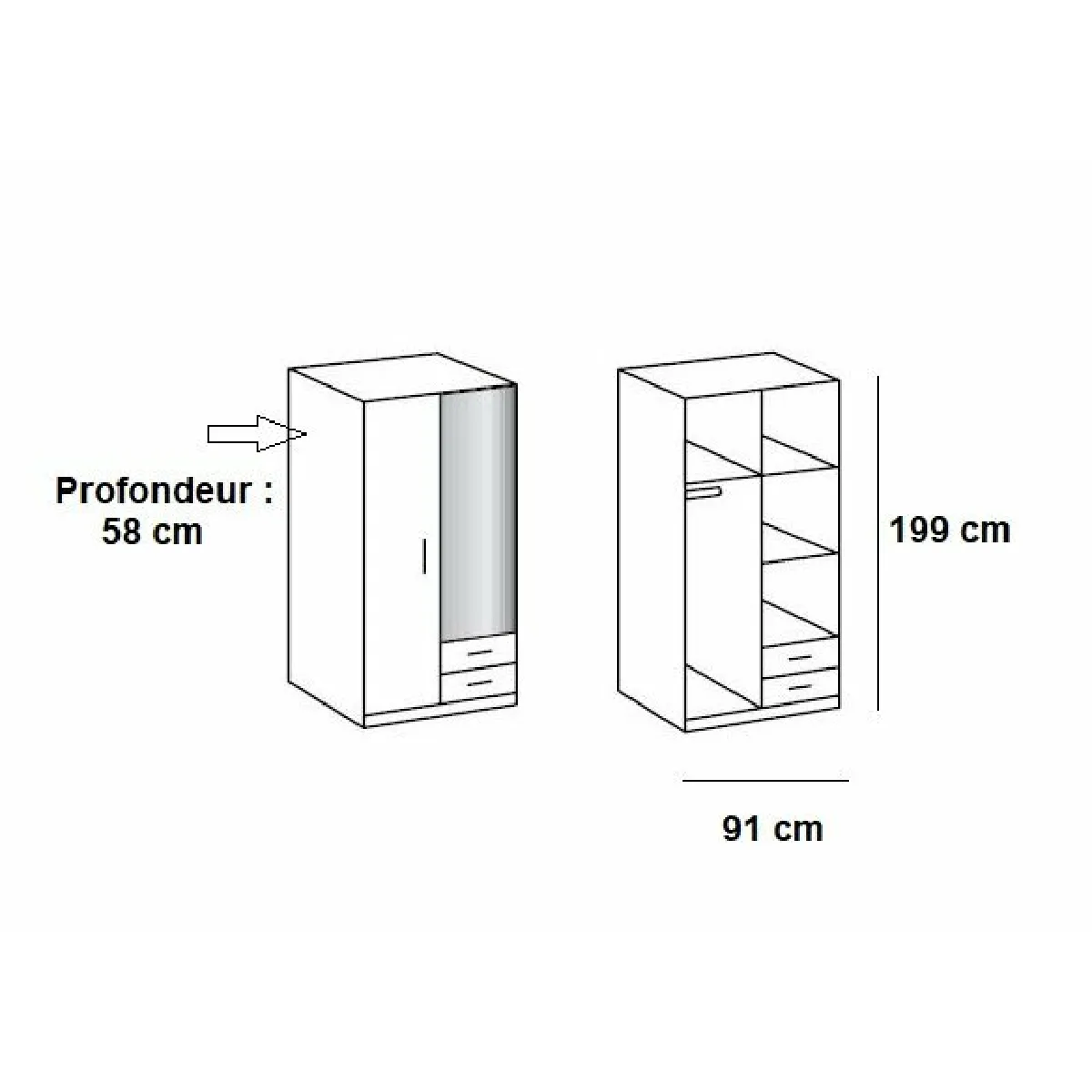 - Armoire 2 portes : 3 étagères, 1 tringle, 2 tiroirs ; armoire 3 portes : 2 étagères, 2 tringles, 2 tiroirs