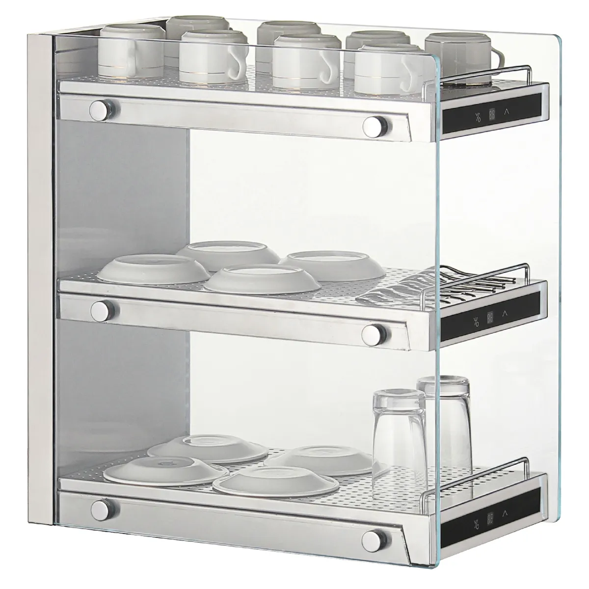 Le maintien à température des tasses optimise l'extraction et la stabilité thermique des boissons. Ce chauffe-tasses à 3 niveaux avec contrôle digital indépendant par étagère permet d'ajuster précisément chaque zone entre 30 °C et 60 °C, pour adapter le préchauffage selon le flux et le type de service. La structure en acier inoxydable avec simple vitrage en verre trempé offre une bonne tenue dans le temps et facilite l'entretien quotidien. L'éclairage LED sélectionnable (rouge, bleu, vert ou cyan) améliore la visibilité des niveaux tout en aidant à repérer l'état d'utilisation dans un espace de travail chargé.