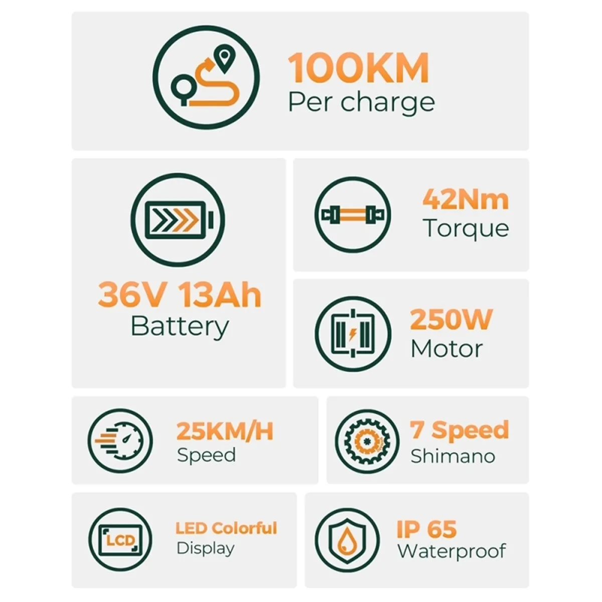 Il est doté d'une batterie lithium-ion 36 V 13 Ah avec un temps de charge rapide de 5 heures. Cette batterie peut alimenter votre vélo jusqu'à 100 km en mode d'assistance au pédalage et 50 km en mode électrique pur sur une seule charge. La conception amovible permet une charge et un stockage faciles.