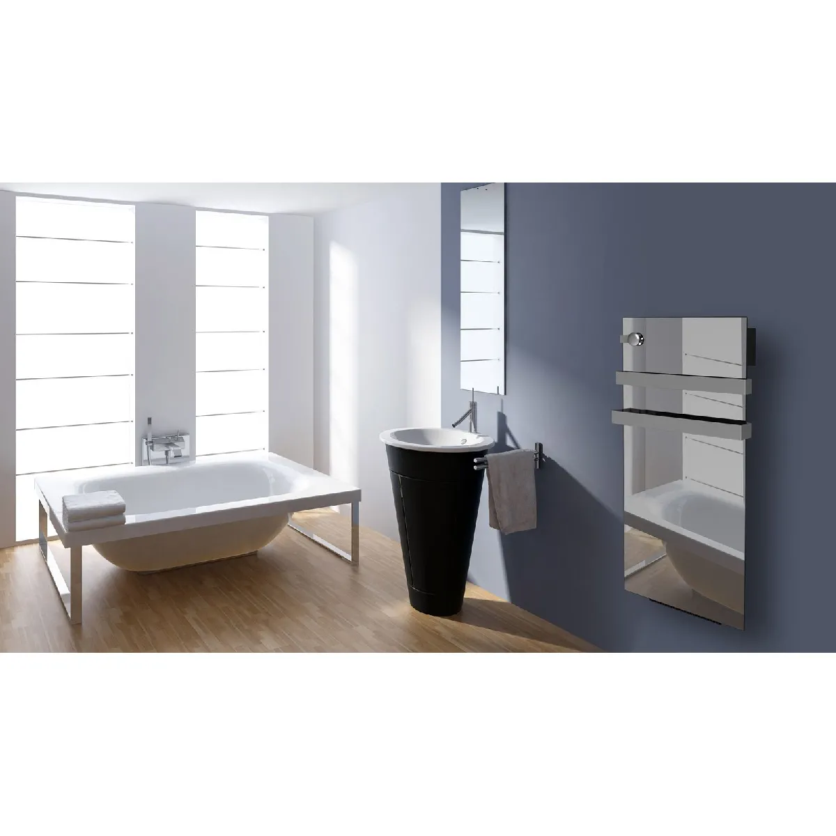 La surface en verre au coloris miroir s'intègre facilement dans une salle de bain tout en offrant un entretien simple. L'électronique est placée à une hauteur confortable, avec un affichage digital lisible pour sélectionner la température et la soufflerie. L'absence de fluide élimine le remplissage et supprime le risque de corrosion lié aux circulations internes. La montée en température est très rapide, utile pour les usages ponctuels et les périodes de forte humidité.