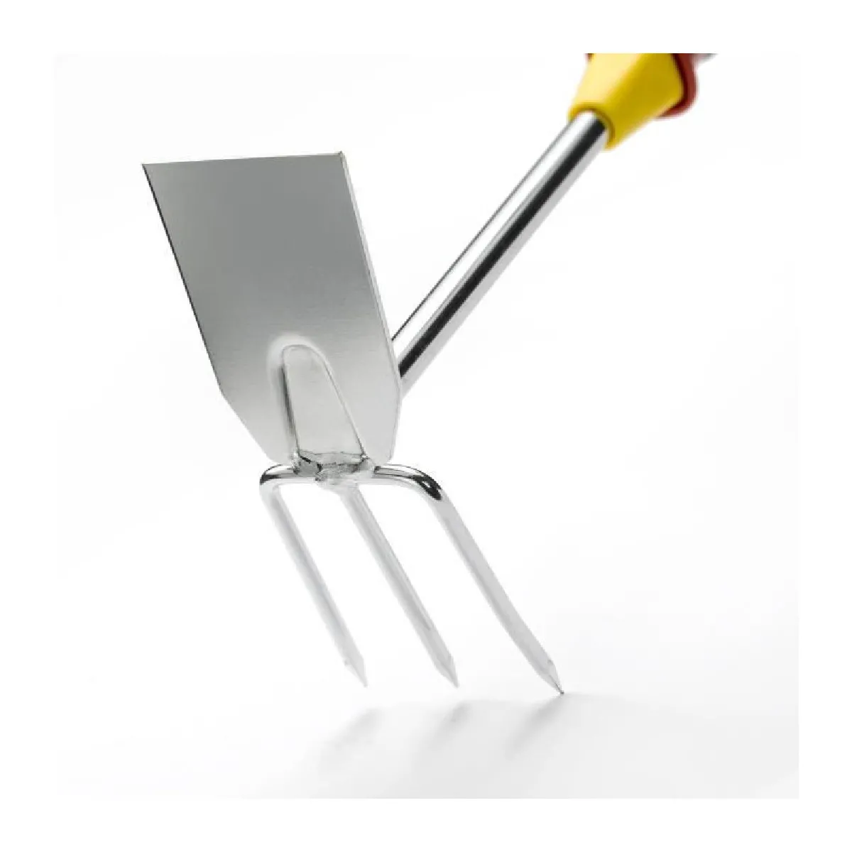 Petite serfouette trois dents a revetement grip anti-dérapant LNK - Spécial Massifs & Rocailles - Sa panne droite désherbe, ses dents pointues ameublissent en douceur la terre et la rendent plus souple - Angle d'attaque optimal - Butées a l'avant et a l'arriere de la poignée - Acier galvanisé - oeillet d'accrochage.