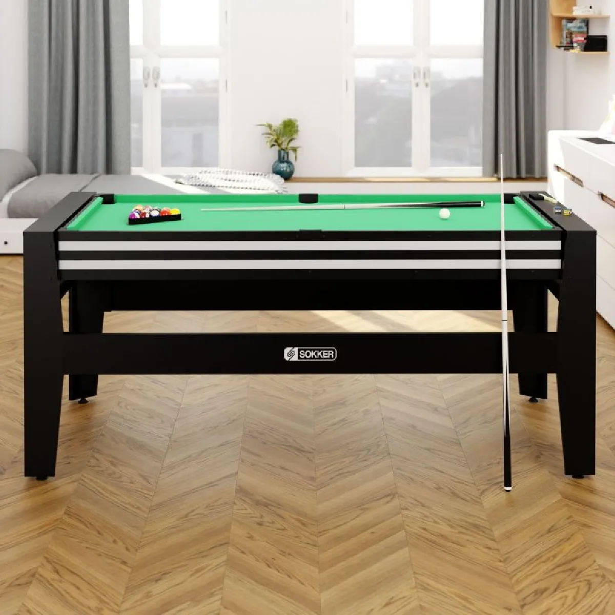 - Accessoires inclus : 2 poussoirs, 2 palets, 1 set de boules américain, 2 queues de billard, 1 triangle, 1 brosse, 2 craies, 2 raquettes de ping-pong, 2 balles de ping-pong, 1 filet de ping-pong