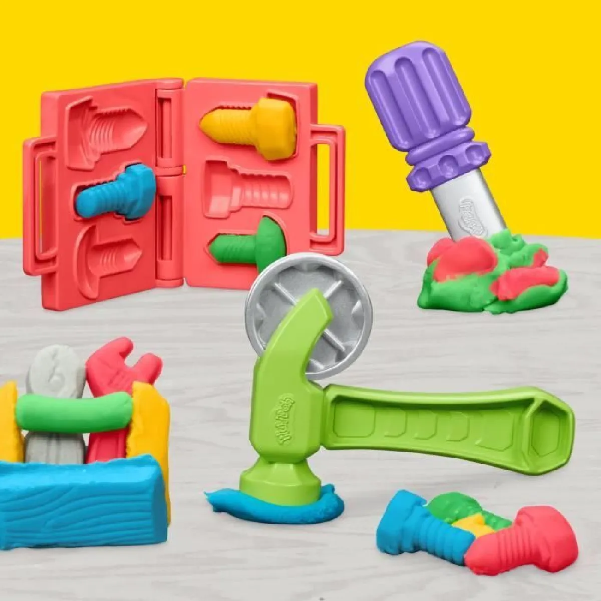 Idéal pour initier les enfants aux gestes simples du bricolage, ce coffret propose un atelier complet dans une boîte avec des outils faciles à manipuler. Le tampon intégré et la scie circulaire factice transforment la pâte en formes variées pour créer planches, boulons ou pièces imaginaires. Les 5 pots de 56 g offrent plusieurs couleurs de pâte à modeler pour multiplier les projets et favoriser la coordination main-oeil. La matière en argile souple Play-Doh se travaille sans effort, se mélange aisément et se nettoie simplement d'une surface lisse.