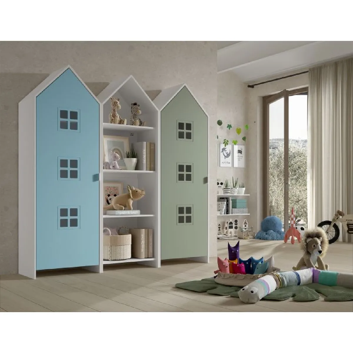 L'ensemble propose une solution de rangement cohérente et ludique pour organiser vêtements, jouets et accessoires dans une chambre d'enfant. La combinaison réunit trois modules coordonnés au design cabane afin d'optimiser l'espace tout en apportant une touche colorée. Les deux portes fermées préservent le contenu des regards et des poussières, tandis que la partie ouverte garde les indispensables à portée de main. Les finitions vertes et bleues créent un repère visuel clair pour trier et ranger selon les usages quotidiens. L'ensemble s'intègre facilement le long d'un mur pour un accès direct et un entretien simple au quotidien.
