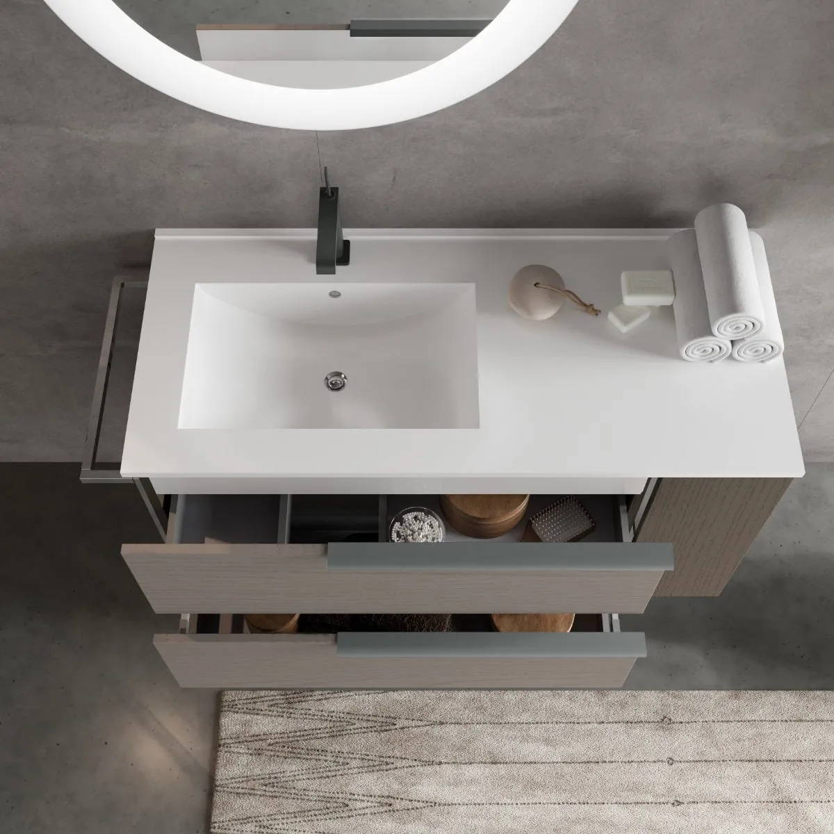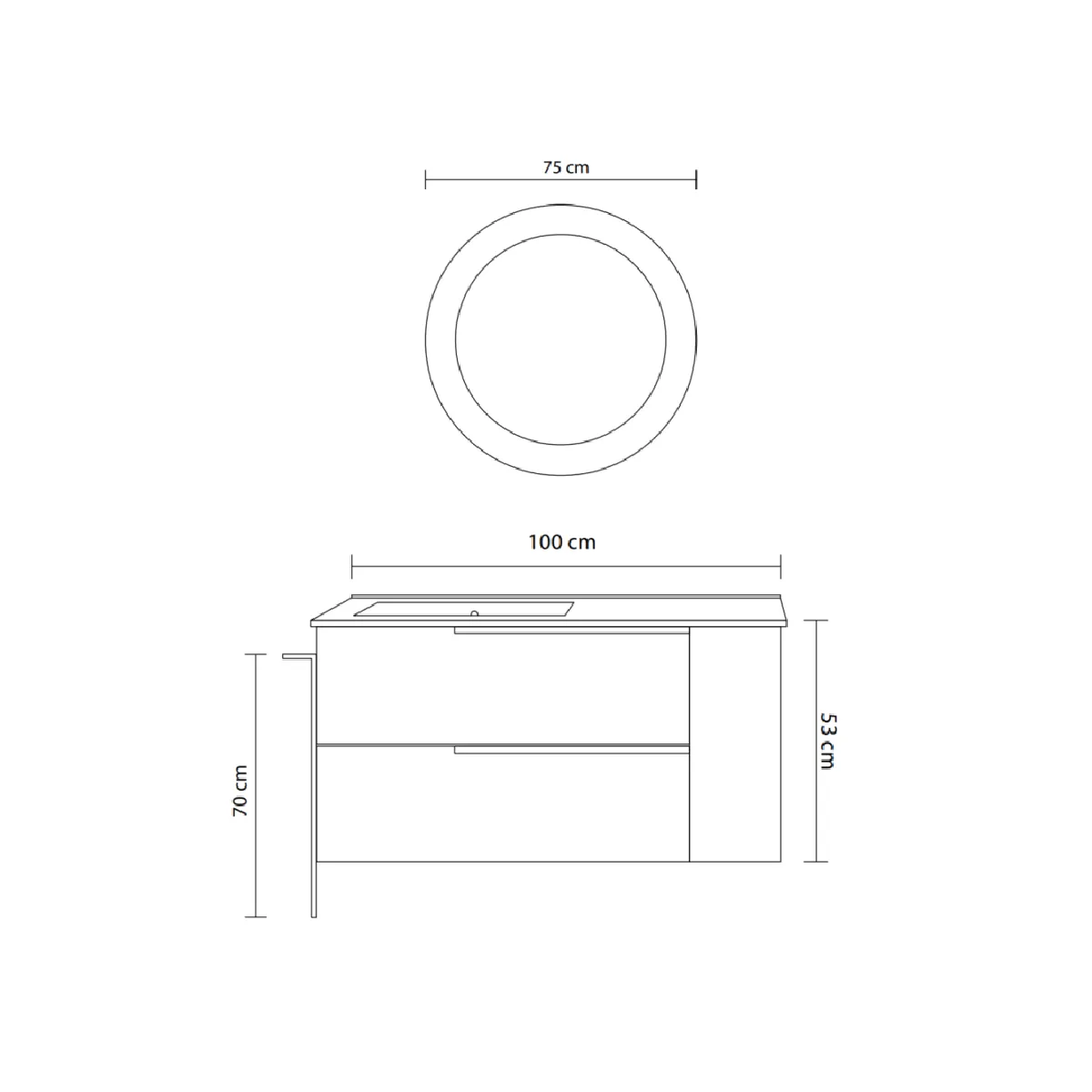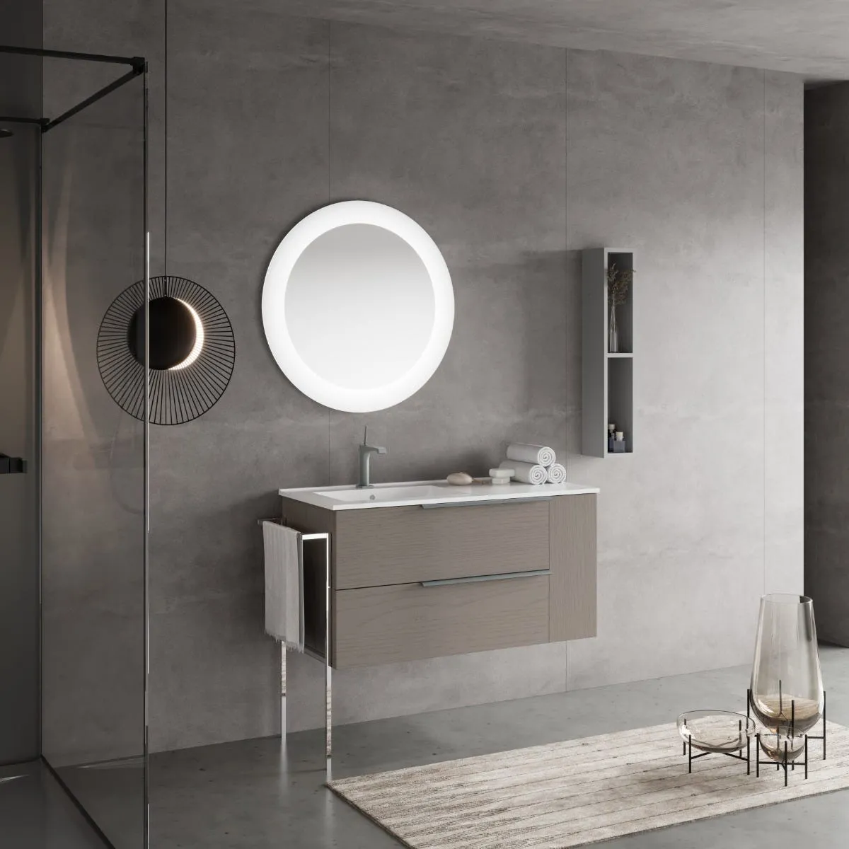 La vasque en céramique de haute qualité, avec la cuve positionnée à gauche pour optimiser l'agencement, s'intègre à l'ensemble dans une finition gris cendré. Le miroir rond avec LED apporte un éclairage intégré utile pour les soins quotidiens et complète l'esthétique coordonnée. Les tiroirs à fermeture lente réduisent les chocs sonores et préservent le mobilier. Les poignées en métal anthracite donnent du relief visuel, tandis que la composition simple sous-vasque avec miroir s'adapte aux besoins d'une salle de bains organisée.