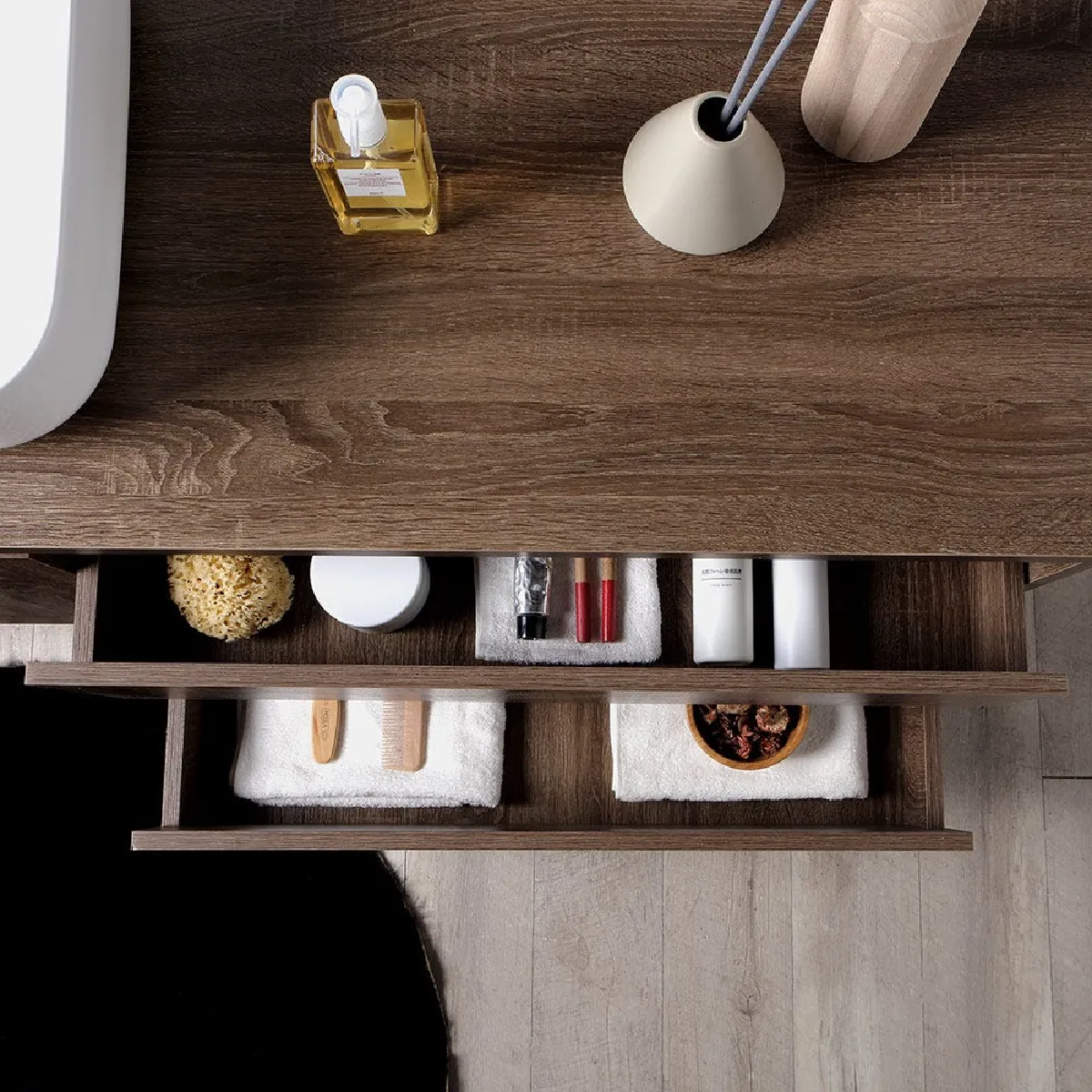 Le meuble suspendu en bois ennobli avec top noyer offre une tablette généreuse pour poser les indispensables et optimiser les routines. L'armoire sous-lavabo comprend une porte et un espace ouvert au dos pour des raccordements simplifiés sans modifications lourdes. Deux tiroirs additionnels permettent un rangement séparé des accessoires de toilette et du linge de bain, afin de conserver une zone épurée et immédiatement accessible.