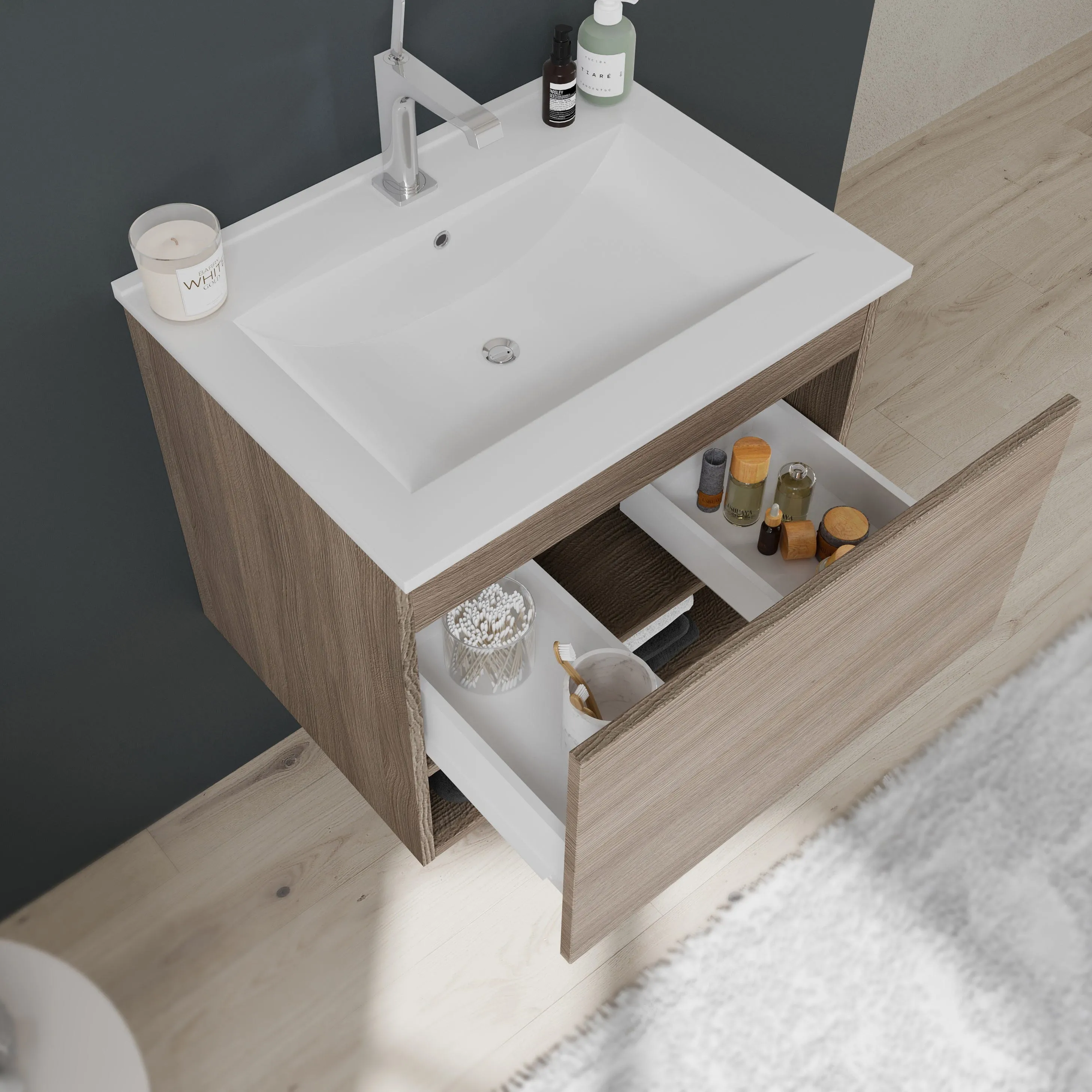 Le meuble suspendu favorise une circulation dégagée et simplifie l'entretien du sol. Son tiroir sous-lavabo à côtés en bois avec fermeture douce protège le contenu et limite les chocs en fin de course. Le compartiment ouvert inférieur constitue un espace d'accès rapide pour serviettes et accessoires, évitant l'encombrement du plan de toilette. Le lavabo en céramique intègre un perçage pour robinet et un trop-plein pour une utilisation sécurisée et conforme aux besoins quotidiens.