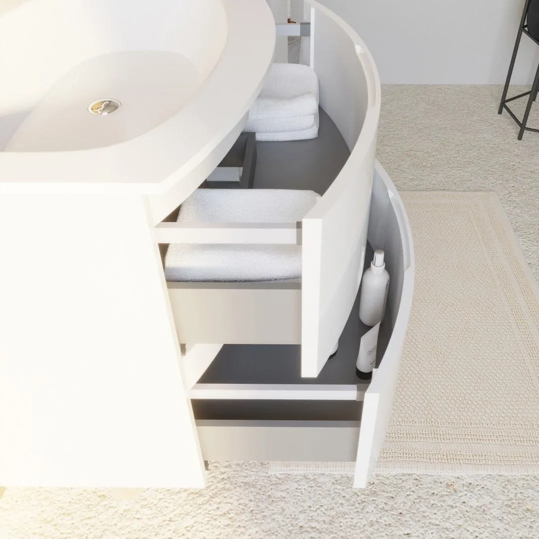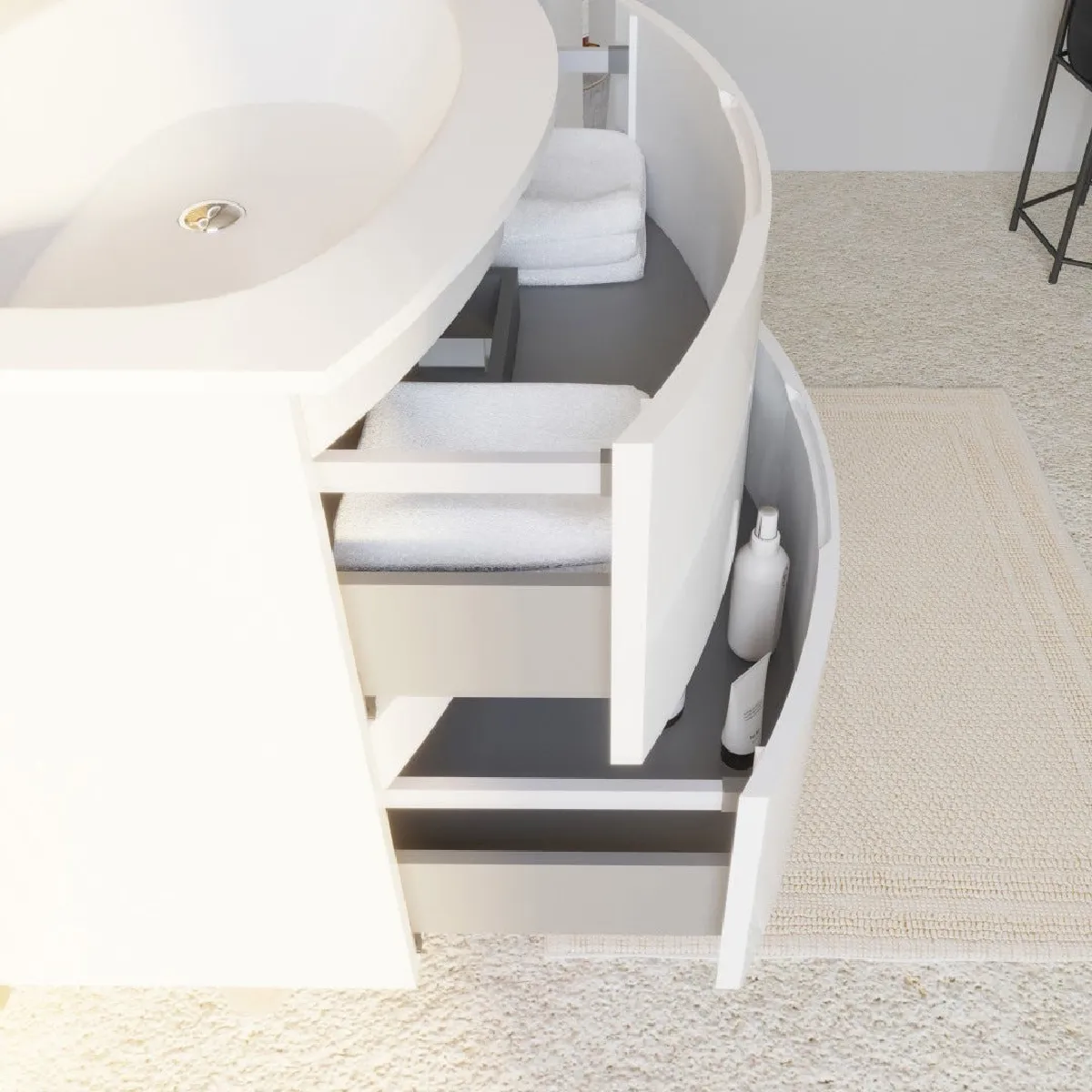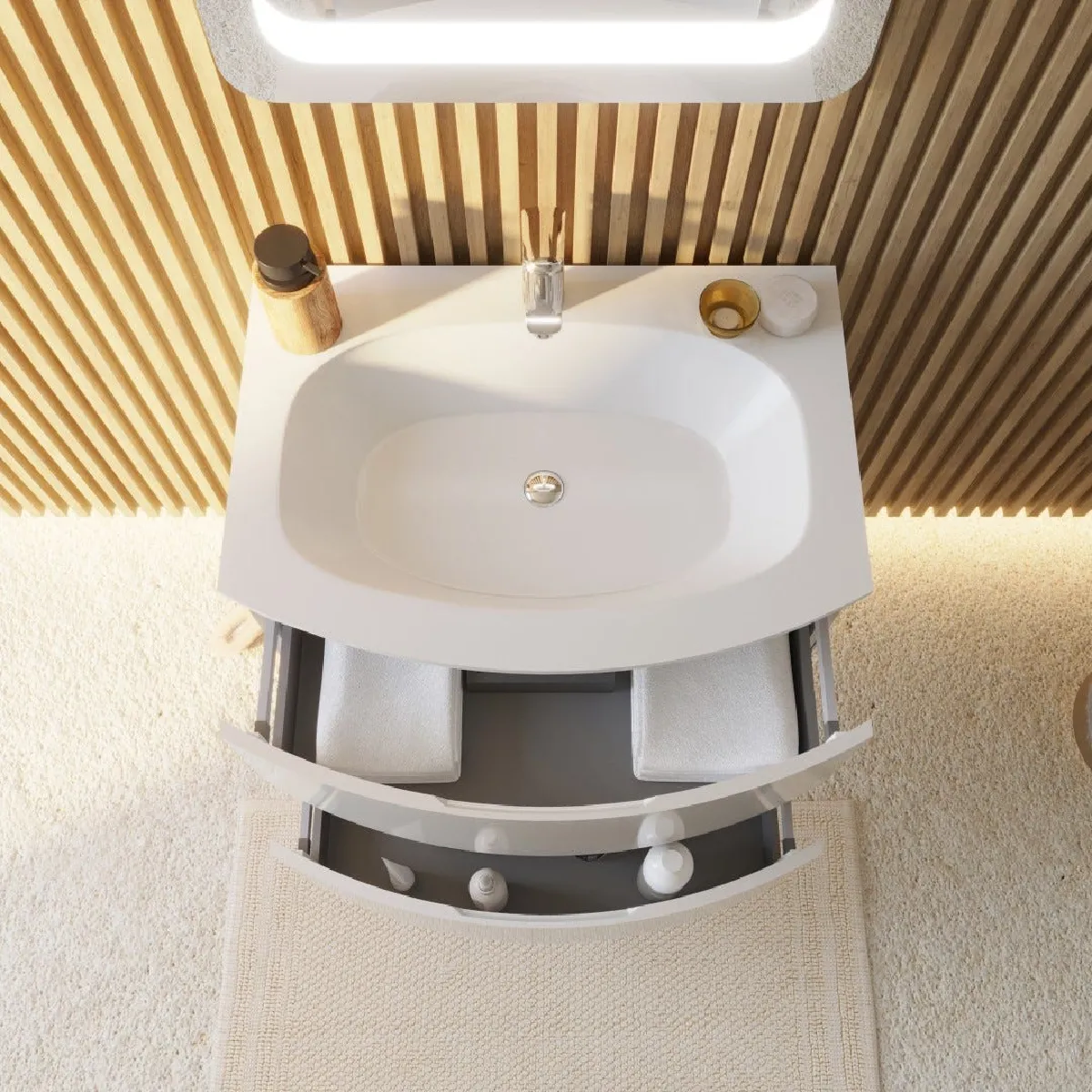 L'armoire murale met l'accent sur une façade incurvée qui facilite l'implantation près d'une porte et optimise l'accès au plan de toilette. Sa finition blanc brillant renforce la luminosité de l'ensemble tout en soulignant les lignes modernes. Le lavabo en résine s'intègre au meuble en suivant la courbe pour une continuité visuelle et une vasque centrale de grande capacité. Les deux tiroirs offrent une manipulation fluide grâce à une poignée à rainure profilée et une fermeture souple antichoc. Le miroir avec éclairage LED améliore la clarté au quotidien et confère une ambiance contemporaine à l'espace lavabo.