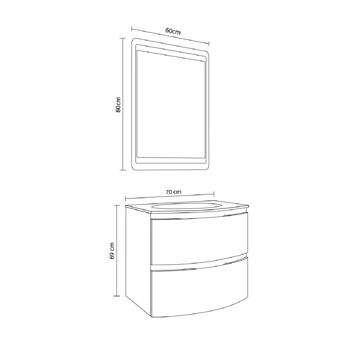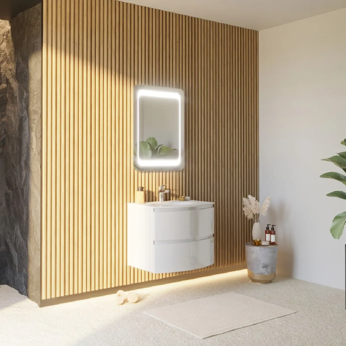 La composition associe un meuble de 70 cm à une vasque intégrée en résine alignée sur la courbe du meuble, pour limiter les débordements et simplifier l'entretien. La structure en bois en finition blanc brillant apporte une touche lumineuse et s'harmonise avec différents revêtements. Le miroir inclus, doté d'un éclairage LED orienté vers la zone du lavabo, améliore la visibilité lors des gestes de toilette sans multiplier les luminaires autour du plan.