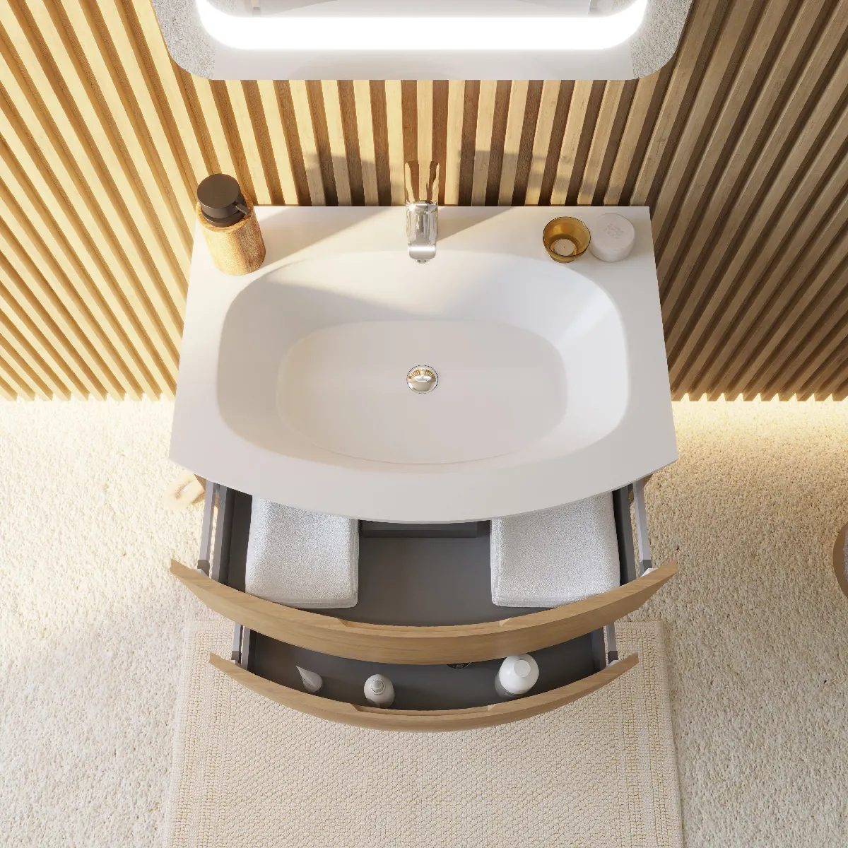 Les deux tiroirs apportent un rangement immédiat pour les essentiels, avec une poignée à rainure façonnée sur le bord supérieur pour une prise en main nette. La fermeture souple et antichoc favorise un usage silencieux et fluide. Le miroir à LED éclaire la zone du lavabo afin d'améliorer les gestes de soin et de maquillage. La finition chêne miel souligne le rendu chaleureux des courbes, créant une unité visuelle avec le plan et la façade.