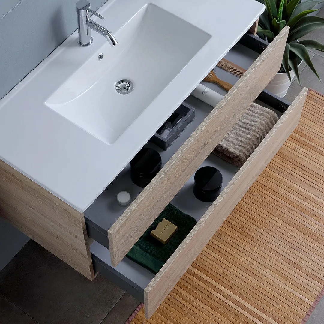 L'ensemble réunit un meuble en bois à l'esthétique classique et épurée, un lavabo en céramique de première qualité et un miroir doté d'un éclairage intégré. La finition chêne naturel s'intègre facilement aux ambiances sobres et met en valeur une salle de bains fonctionnelle au quotidien. Les deux tiroirs spacieux sous la vasque offrent un rangement ordonné pour les serviettes et les indispensables de toilette, tout en conservant une façade harmonieuse. Pensé pour un usage régulier, l'ensemble privilégie hygiène, facilité de nettoyage et praticité, avec des panneaux de bois nobles et des éléments conçus pour une utilisation durable.
