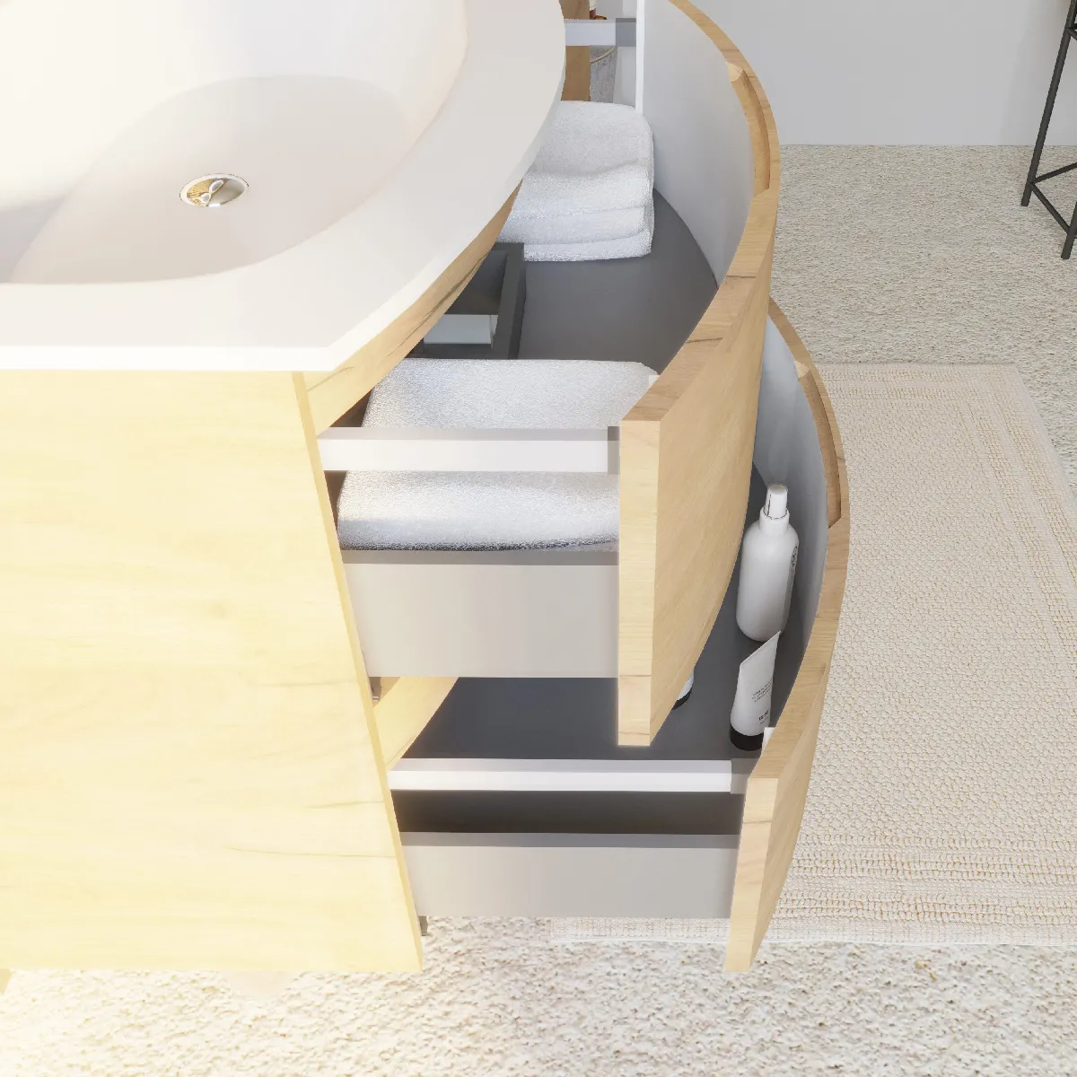 La façade incurvée de cette armoire optimise l'encombrement en bord de passage tout en offrant une organisation claire grâce aux deux tiroirs et à la porte latérale. Le miroir rabattable avec éclairage intégré éclaire la zone de la vasque pour les gestes du quotidien. La finition chêne miel met en valeur les courbes continues entre le meuble et le plan avec vasque intégrée, pour une apparence homogène. La poignée à rainure profilée favorise une préhension discrète, tandis que la fermeture souple et antichoc des tiroirs améliore le confort d'usage et réduit les bruits en fermeture.