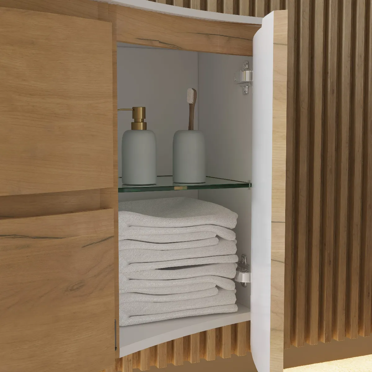 Armoire de salle de bain murale incurvée en chêne miel avec miroir