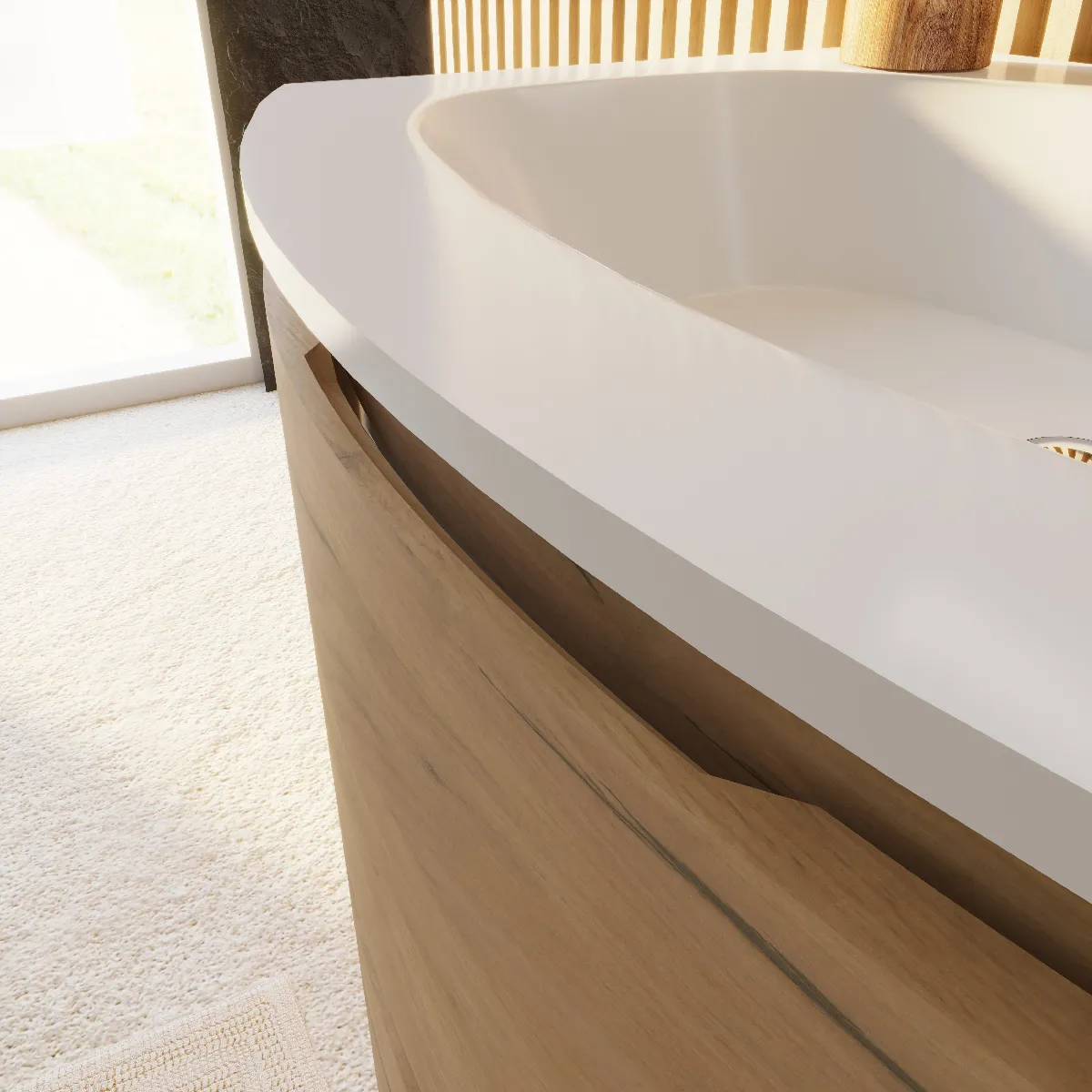Avec sa structure murale, l'ensemble libère l'espace au sol et facilite l'entretien, tandis que la vasque intégrée en résine suit la courbe du meuble pour une surface continue. La vasque latérale de grande capacité améliore le confort d'utilisation au quotidien, et la porte latérale dédiée aux accessoires et soins permet de séparer les rangements. La finition chêne miel souligne un rendu uniforme et met en avant le dessin des courbes douces de la façade.