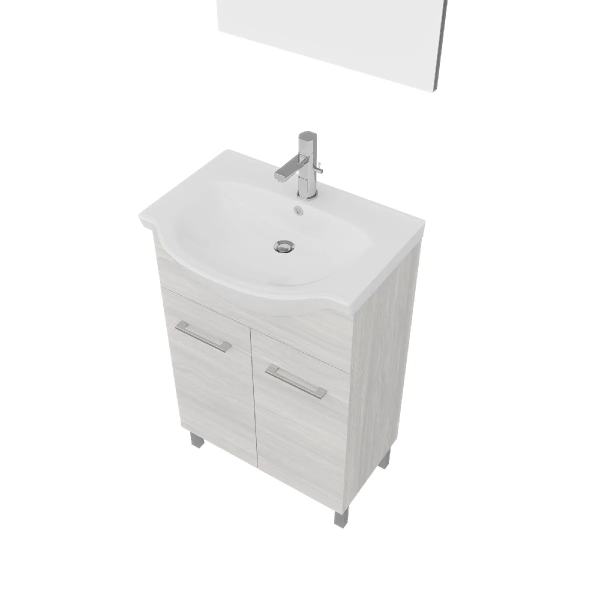 Idéal pour optimiser un espace réduit, cet ensemble associe un meuble sur pied de 55 cm, un lavabo en céramique et un miroir assorti. La finition effet chêne gris s'intègre aisément dans une salle d'eau ou un WC avec des lignes classiques et une esthétique sobre. Le format compact facilite l'implantation dans les pièces étroites tout en conservant une zone de lavage confortable. Les détails de poignées et pieds chromés apportent une touche soignée et harmonieuse. Le lavabo en céramique assure une surface lisse et simple à entretenir, tandis que le miroir complète la zone de toilette pour une utilisation quotidienne claire et pratique.