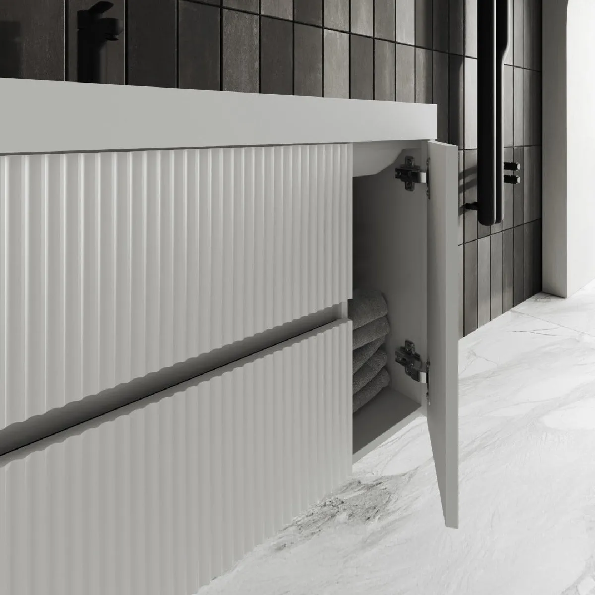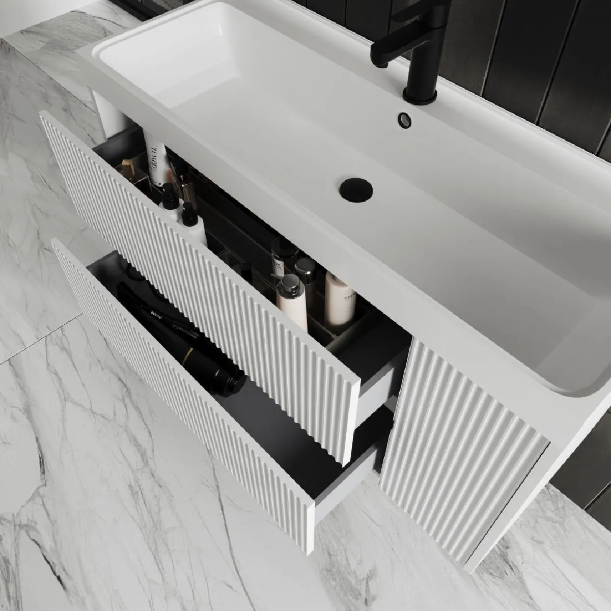 ehaussez votre salle de bains avec notre Meuble de Salle de Bains de 100 cm, faisant partie de la prestigieuse collection Cortina. Ce meuble suspendu, fabriqué avec des matériaux de haute qualité, allie design moderne et fonctionnalité impeccable. Sa structure associe des panneaux en bois mélaminé à une élégante façade en MDF effet canné, le tout dans une couleur blanc mat attrayante. Avec deux tiroirs et une porte, il offre un grand espace de rangement pour maintenir votre salle de bains bien ordonnée. La fermeture soft close innovante garantit une expérience d'utilisation confortable. Le lavabo en résine inclus est caractérisé par une grande cuve, avec des trous pour le robinet et le trop-plein, offrant fonctionnalité et style.
