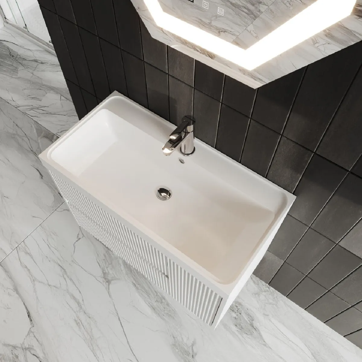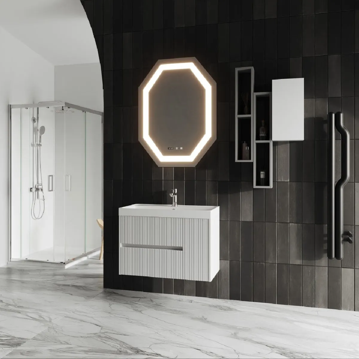 Meuble de salle de bain - Blanc cannetté - 80 cm - Miroir LED octogonal