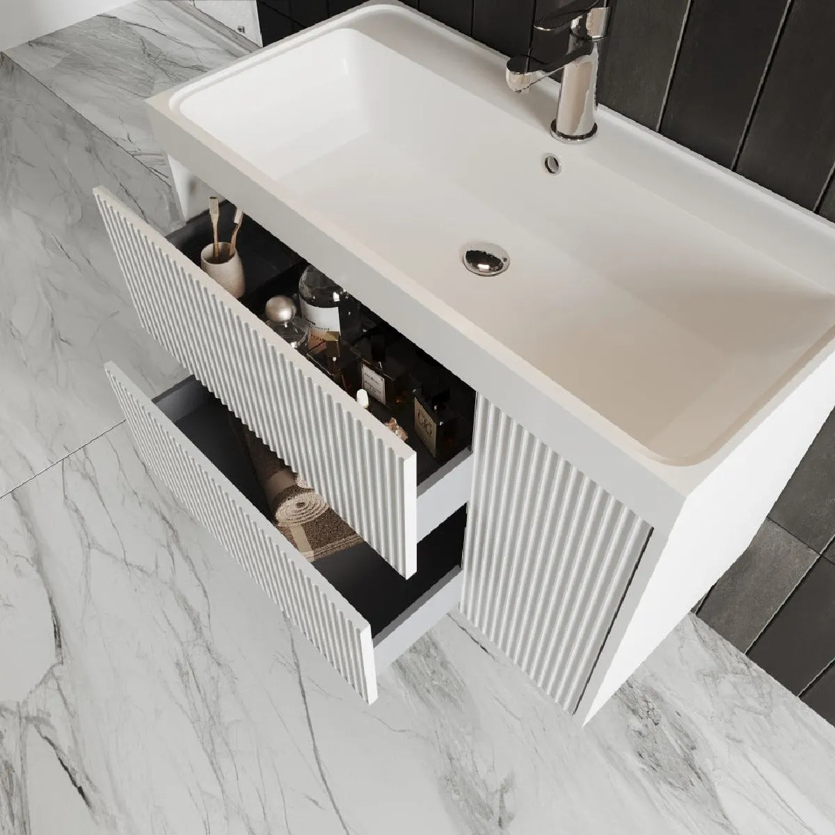tez à jour votre salle de bain avec notre meuble de salle de bain suspendu de la collection Cortina, une solution élégante alliant design moderne et fonctionnalité. Avec une largeur de 80 cm, une hauteur de 56,5 cm et une profondeur de 40 cm, ce meuble offre un espace de rangement généreux sans compromettre le style. La structure en panneaux de bois mélaminé offre robustesse et durabilité, tandis que les façades en MDF canné blanc mat ajoutent une touche de sophistication. Avec deux tiroirs et une porte, vous avez de l'espace pour organiser vos produits de salle de bain de manière ordonnée. Le lavabo en résine est spacieux et présente des trous pour le robinet et le trop-plein. Complétant l'ensemble, un miroir octogonal de 100x75 cm avec éclairage LED intégré, créant une atmosphère chaleureuse et fonctionnelle.