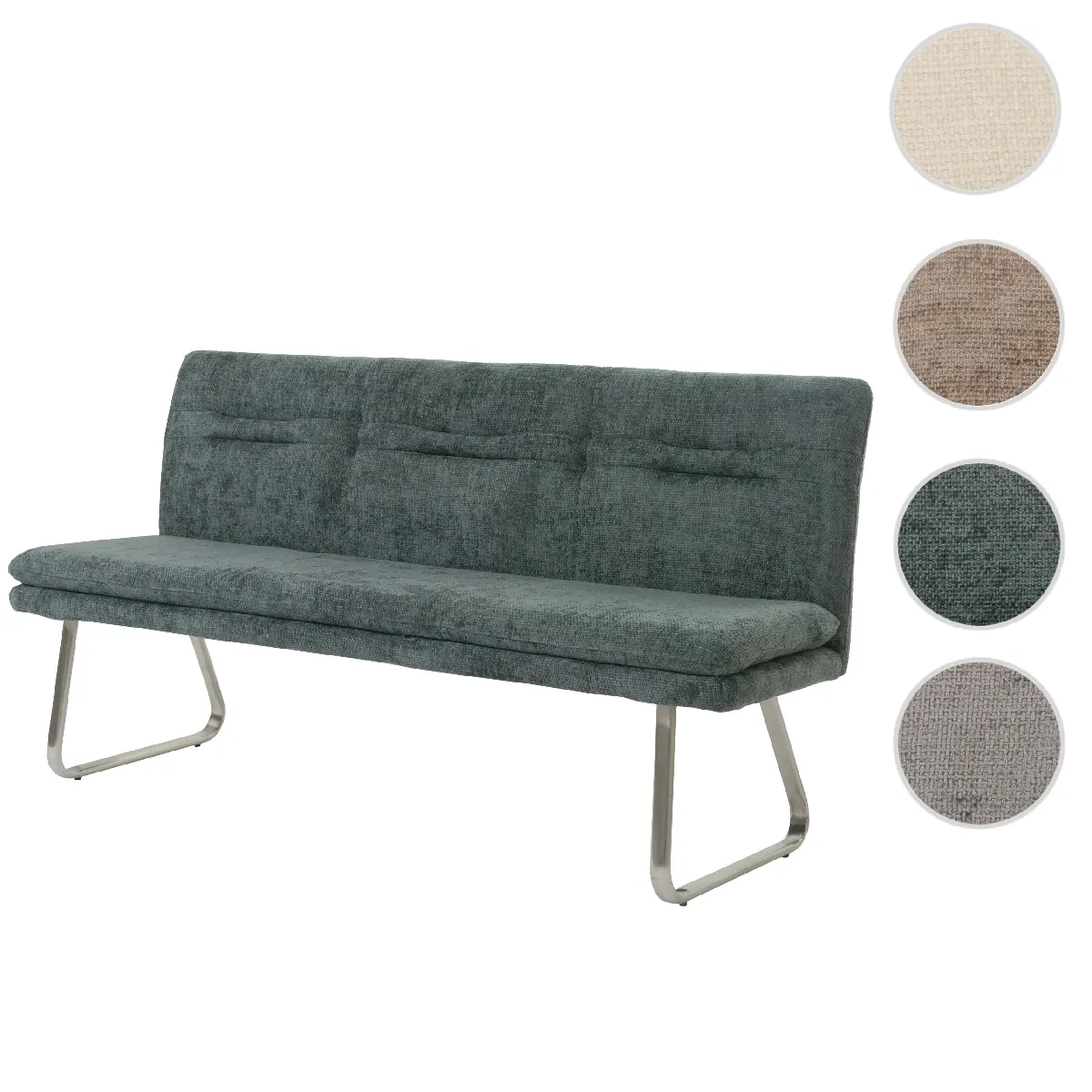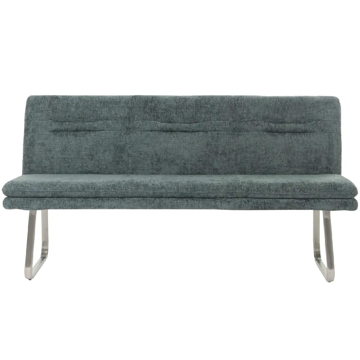 - La banquette H70 séduit par son revêtement moderne en tissu chenille, ses élégantes coutures décoratives et ses bords arrondis. Elle offre de la place pour trois personnes, un dossier confortable et repose sur des pieds en acier inoxydable brossé avec des protections de sol réglables.
