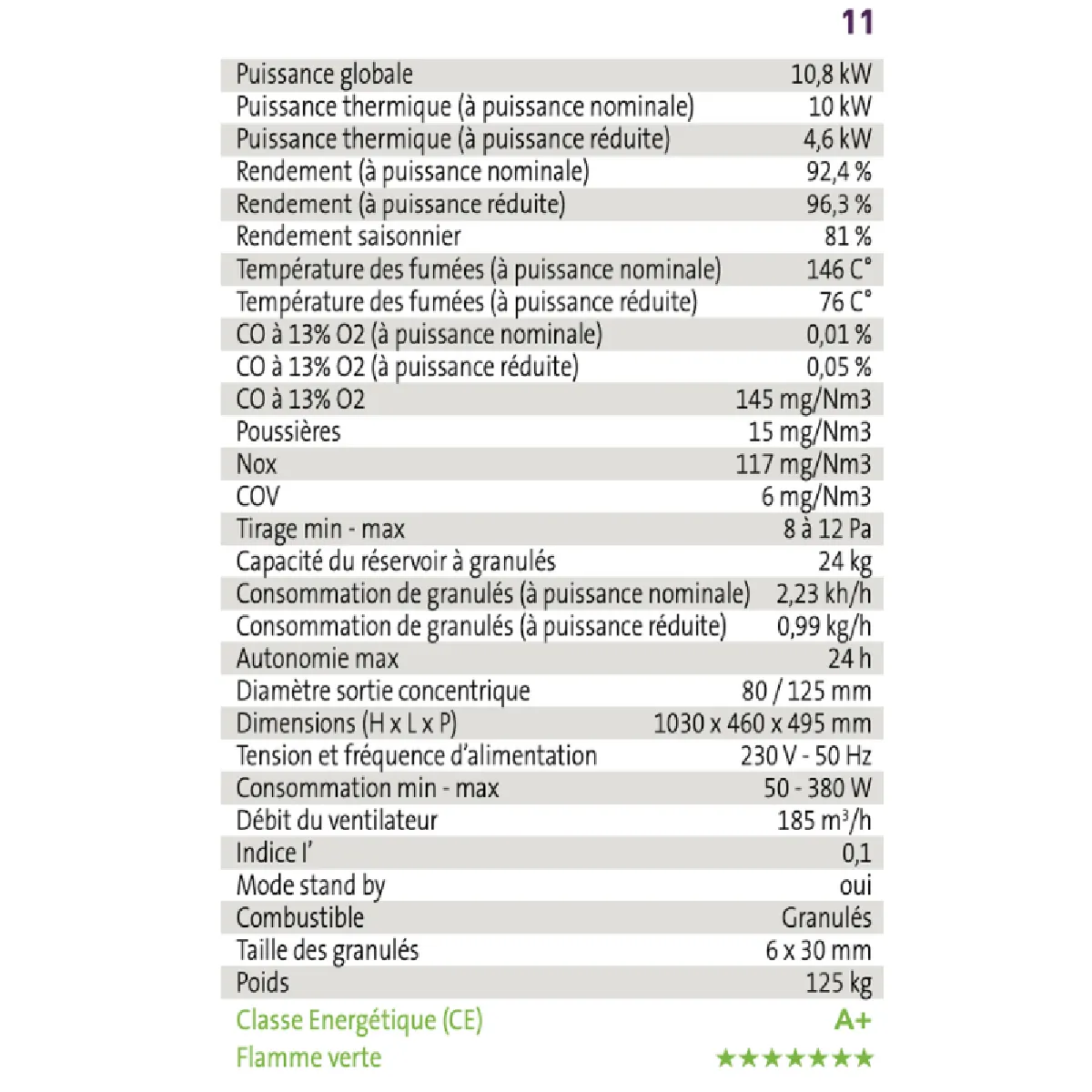 Commentaire vendeur : Le MARINA 11 concentrique étanche, flamme verte et éco design de fabrication italienne a un très haut rendement (96.30%) Sa sortie pour les fumées par le dessus au lieu d'une sortie par l'arrière permet d'installer le poêle au plus proche du mur (5 cm)Cela permet de réduire l'encombrement en profondeur tout en optimisant l'espace habitable et facilite l'installation.Ce type d'installation garantie un tirage parfait, sans retour de fumée. Il bénéficie d'une autonomie de 24h grâce à son réservoir à granulés de 24kg Système de coupure automatique en cas d'ouverture de la porte Sonde de protection anti-feu avec fusible de coupure en cas de surchauffe Son étanchéité vous permet de l'installer dans toutes les configurations : sortie façade, sortie toiture et au-dessus du faîtage.SI VOUS AVEZ BESOIN DE CONSEILS OU DE MATÉRIEL SUPPLÉMENTAIRE (CONDUITS) POUR FINALISER VOTRE INSTALLATION CONTACTEZ LE : 04 23 36 01 08. Nos points forts : Garantie 10 ans sur le corps de chauffe Certification Flamme Verte Marque française avec hotline basée en France Pièces détachées en stock, disponibles sous 24/48h Coloris disponible : Blanc Bordeaux Noir OPTION WIFI ET TELECOMMANDE Vous pouvez bénéficier en option du WIFI et/ou de la télécommande afin de commander à distance votre poêle via vos ordinateurs, tablettes et smartphones.Le tout se fait à travers une application Apple ou Android, où que vous soyez, quand vous le voulez.Cette application pe...
