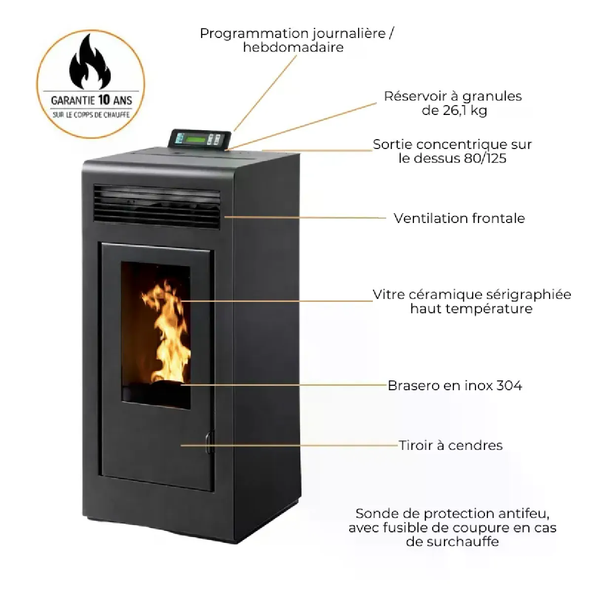 Poêle à granulés concentrique étanche - Rendement 96,30% - Autonomie 24h - Réservoir 24kg