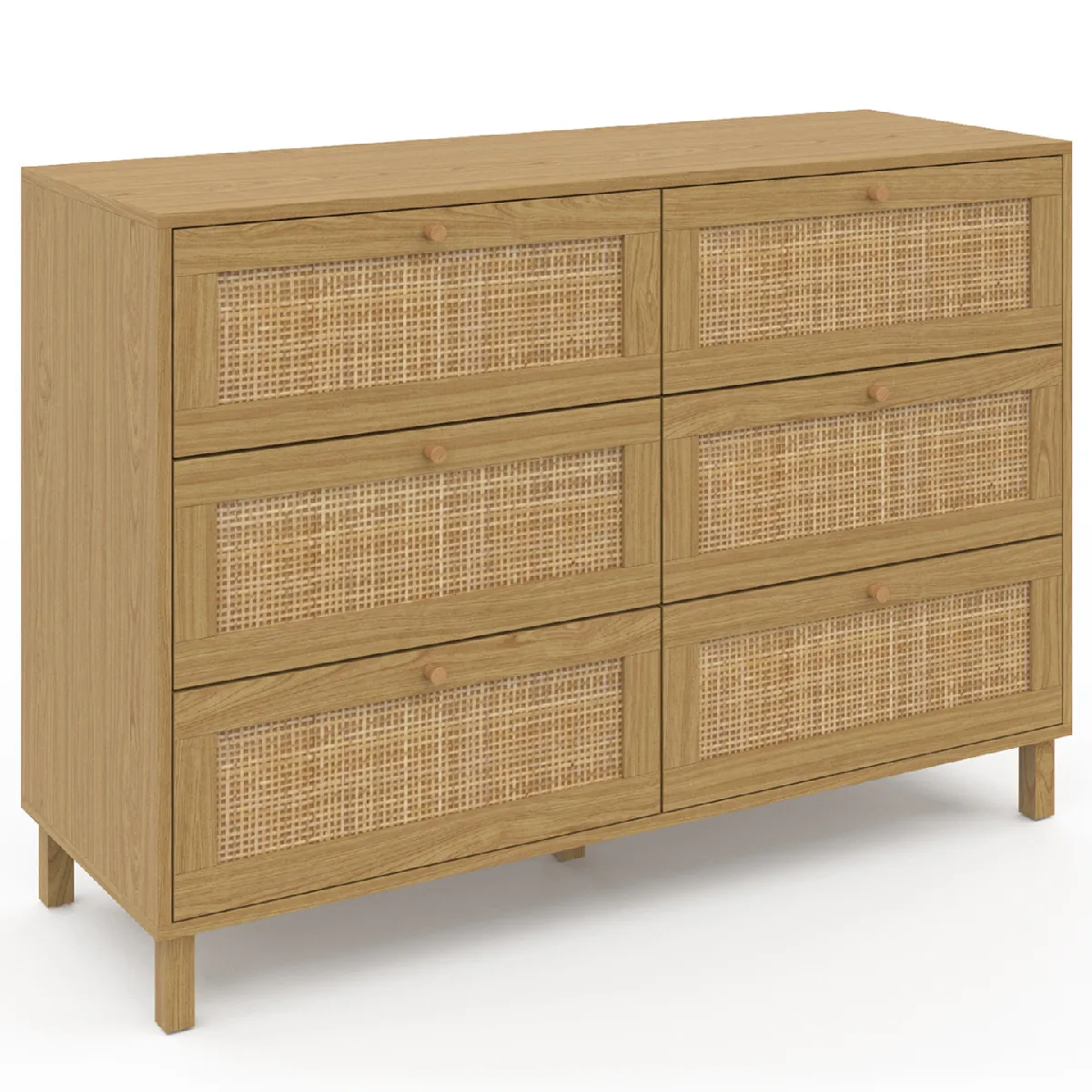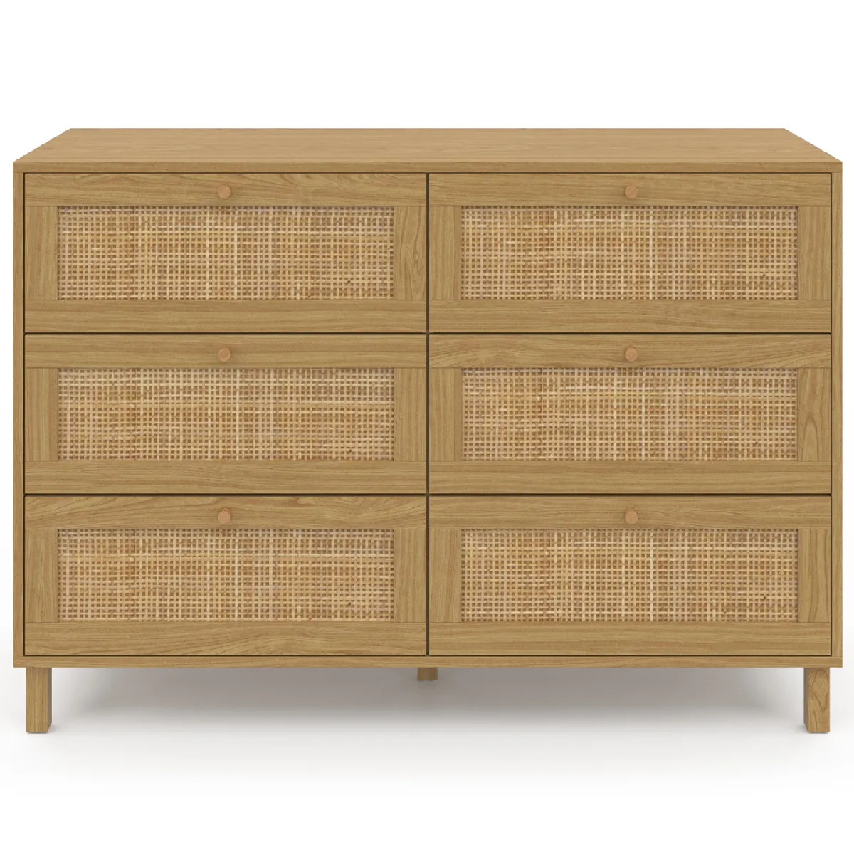 Optez pour cette jolie commode 6 tiroirs HANAE et apportez une touche naturelle et exotique à votre intérieur. Grâce à ses tons naturels, cette commode se mariera parfaitement avec tous types de décoration pour apporter chaleur et modernité à votre intérieur. Installez-la aussi bien dans votre chambre à coucher, votre dressing ou même votre bureau. Sa maxi capacité de rangement vous permettra d'organiser tous vos vêtements et d'y ranger même les linges plus volumineux, tout en étant à l'abri de la poussière et de l'humidité. Profitez dès à présent de ses larges tiroirs, dotés de façades en cannage naturel, pour ranger tous vos pulls, votre linge de lit et vos serviettes de bain les plus encombrantes. De plus, ses 4 pieds de 10.5 cm de hauteur, sa structure en panneaux de particules et ses façades de tiroirs en cannage naturel lui assurent stabilité et robustesse au quotidien.Cette commode au style très tendance, avec ses façades en cannage naturel et sa structure au coloris bois deviendra une pièce forte de votre chambre à coucher et rendra l'atmosphère décontractée ! Alors n'hésitez plus et optez pour la commode HANAE 6 tiroirs au look ultra tendance ! Dimensions de la commode 6 TIROIRS HANAEDimensions globales : Longueur 115 cm x largeur 40 cm x Hauteur 80 cmDimensions des pieds : L. 3 x l. 3 x H. 10.5 cmDimensions intérieures des tiroirs : L. 50.5 x l. 29 x H. 13 cmDimensions façade des tiroirs : L. 55.5 x H. 22 cmDimensions de la fenêtre en cannage : 46 x 12.5 cmMatériaux : panneaux de particules + cannage naturelColoris : bois / naturelÀ monter soi-mêmeRetrouvez également le lot de 2 chevets HANAE effet naturel cannage.Retrouvez toutes nos commodes sur notre boutique en ligne.