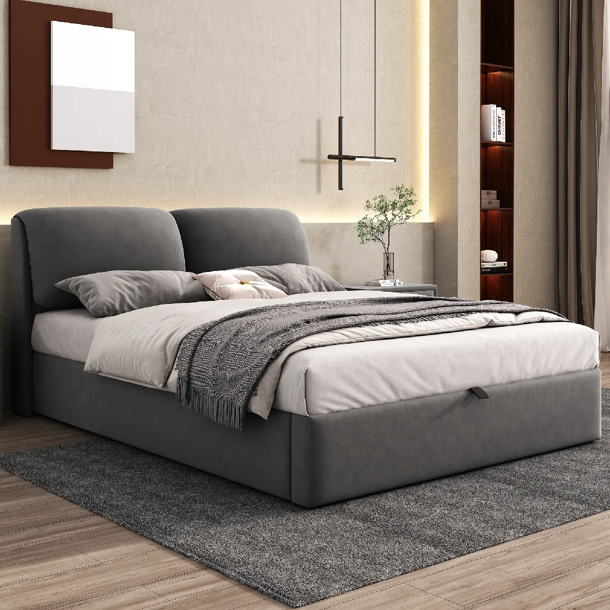 Conception de lit hydraulique: le lit hydraulique est conçu pour que vous puissiez facilement ouvrir la boîte de lit et y ranger vos affaires. Cette conception rend le stockage plus pratique.