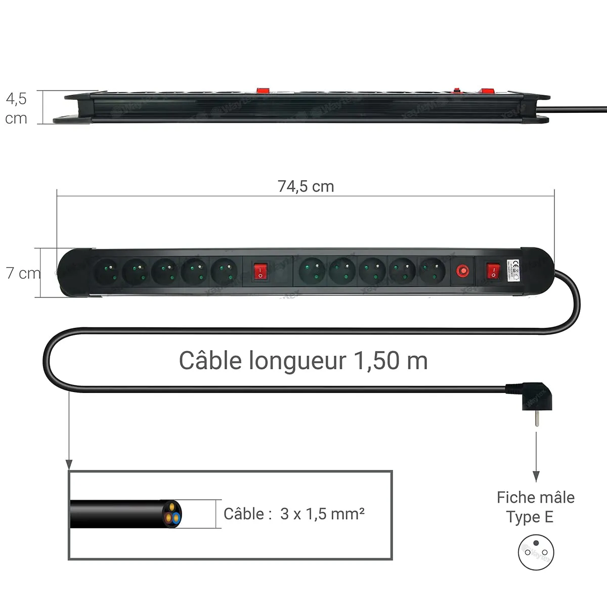 - 10 prises françaises avec orientation à 45° pour faciliter les fiches coudées