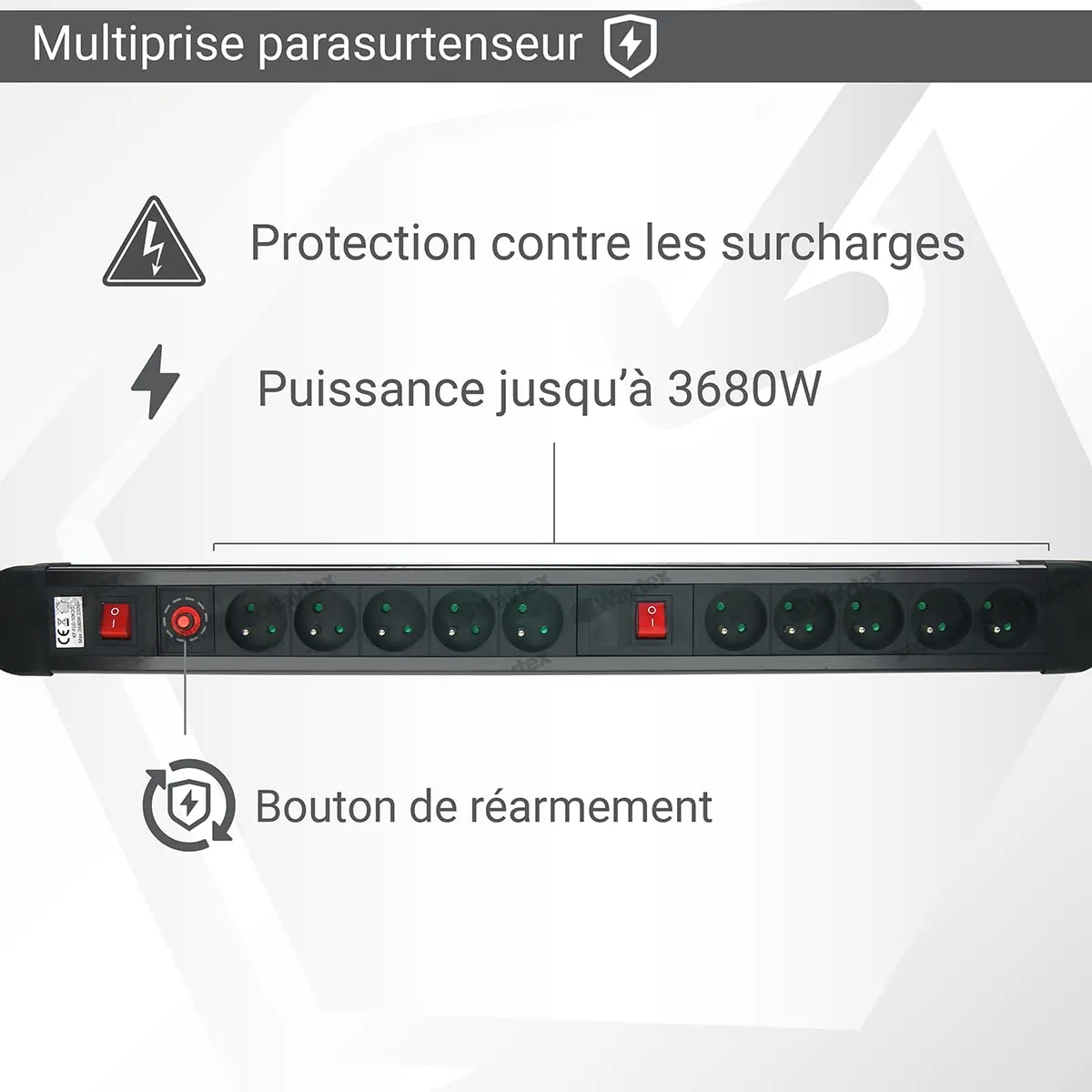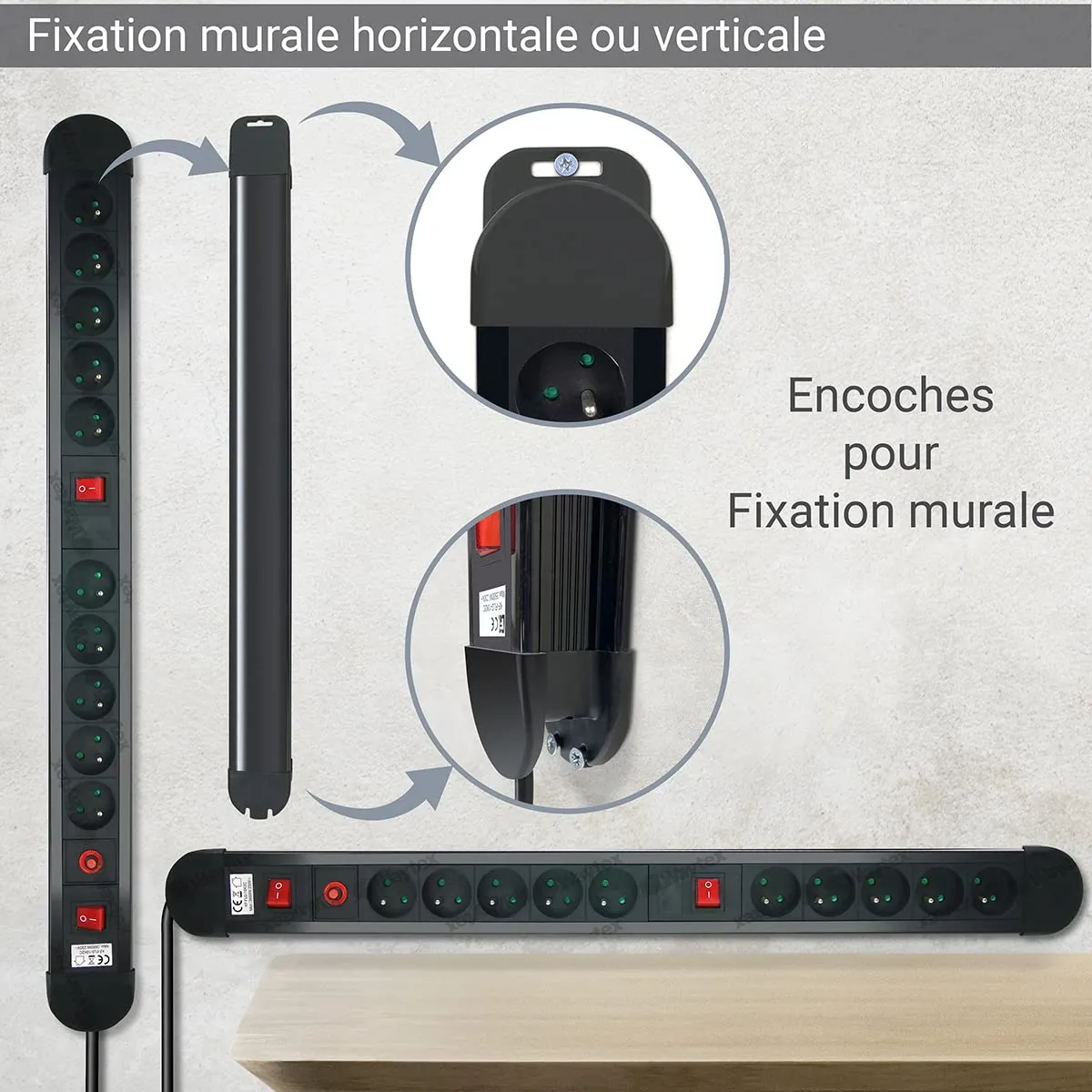 Le câble de 1,5 m offre une portée pratique, et les encoches au dos pour une fixation murale ou sous bureau aident à libérer l'espace au sol. La réinitialisation est simple grâce au bouton de réarmement. Avec 10 prises au format français, la distribution reste lisible et accessible pour l'ordinateur, l'imprimante, l'écran ou la TV. Tension nominale 230 Volts.