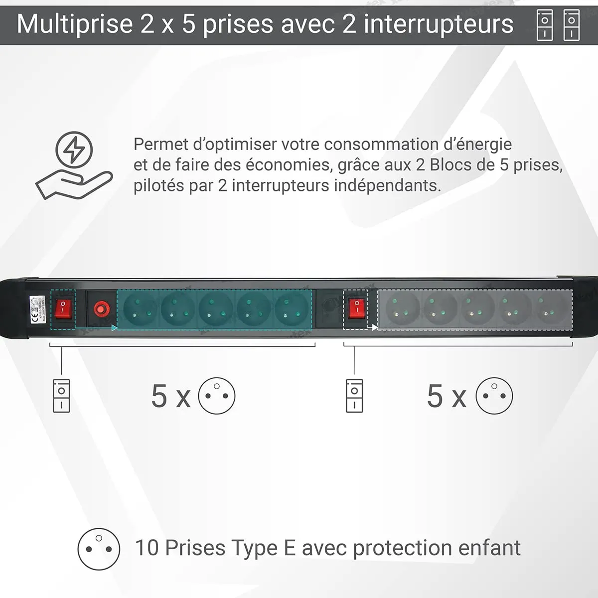 - 2 interrupteurs indépendants pour piloter deux groupes de 5 prises