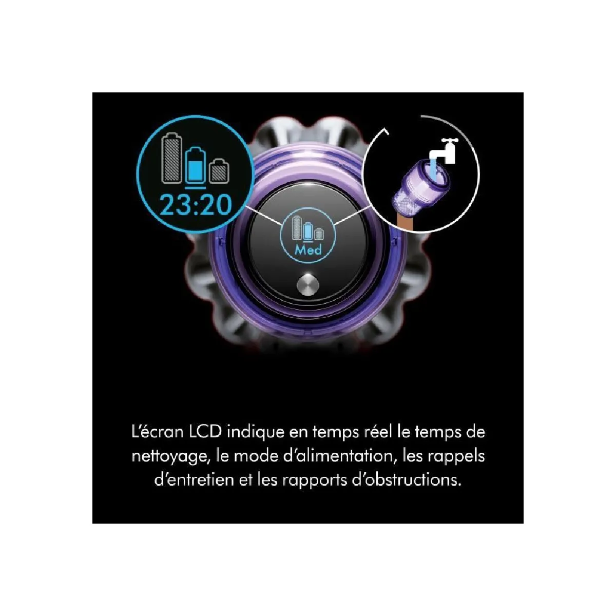 Le moteur Hyperdymium de Dyson est annoncé pour des vitesses élevées, avec une aspiration dédiée aux poussières fines et débris du quotidien. L'appareil propose jusqu'à 60 minutes d'usage, utile pour couvrir plusieurs pièces sans interruption. L'écran intégré affiche l'autonomie restante et l'état de fonctionnement, ce qui aide à planifier le parcours de nettoyage et à éviter les arrêts imprévus. Le format stick se transforme en aspirateur à main intégré pour traiter les escaliers, les tissus d'ameublement ou l'intérieur de la voiture.